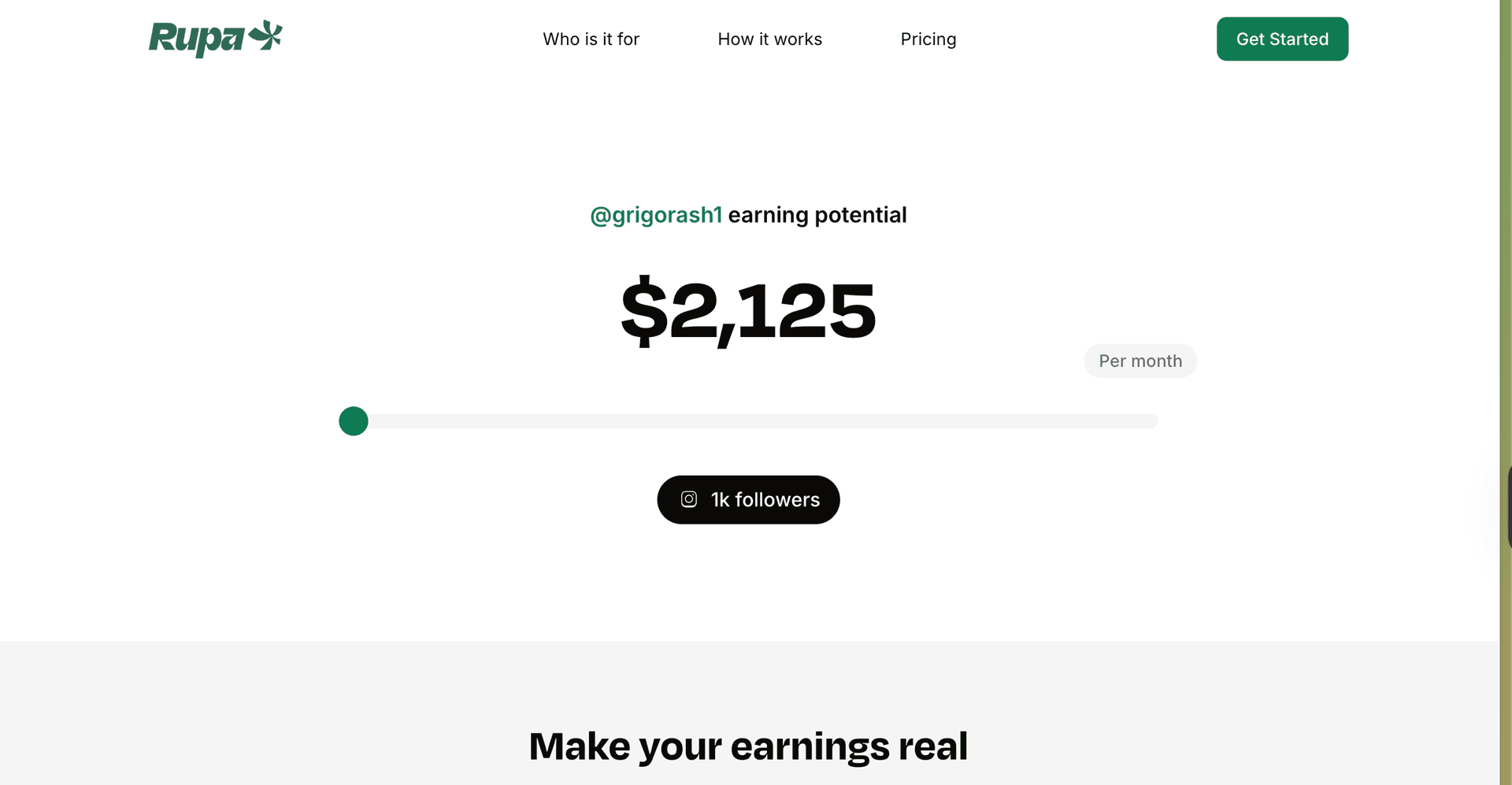 Most Creators Never Go Full-Time. But if you have 5-50K engaged followers, you have everything you need to go full-time - except knowing what to sell and how to sell it. Building landing pages, setting up payments, writing sales copy, and figuring out what product to create? It's overwhelming. The Solution: Rupa automates the entire monetization process from product ideation to checkout. How It Works: - AI analyzes your audience to suggest digital products tailored to your niche - Upload your content, pick a visual theme and the landing page and checkout are ready - Rupa handles payments and delivery so you can focus on creating - You own the customer relationship. No platform dependency, no algorithm changes affecting your income From fitness programs to online courses to PDF cookbooks - Rupa turns your social media engagement into revenue. Built by ex-Google creator economy veterans who've helped thousands of creators launch profitable digital products.