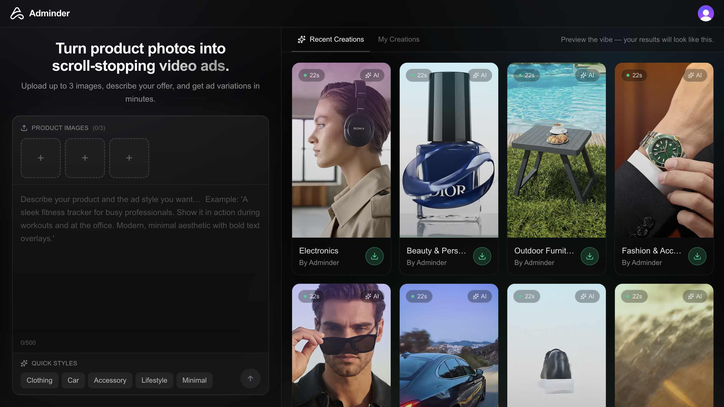 Adminder generates video ads with Google Veo 3-level quality, but at roughly 2.5x lower generation cost. We built it to make creating short product ads less time-consuming and less expensive than traditional video workflows. You upload a few product images, add a short description, and get simple, usable video ads without dealing with timelines or editors.