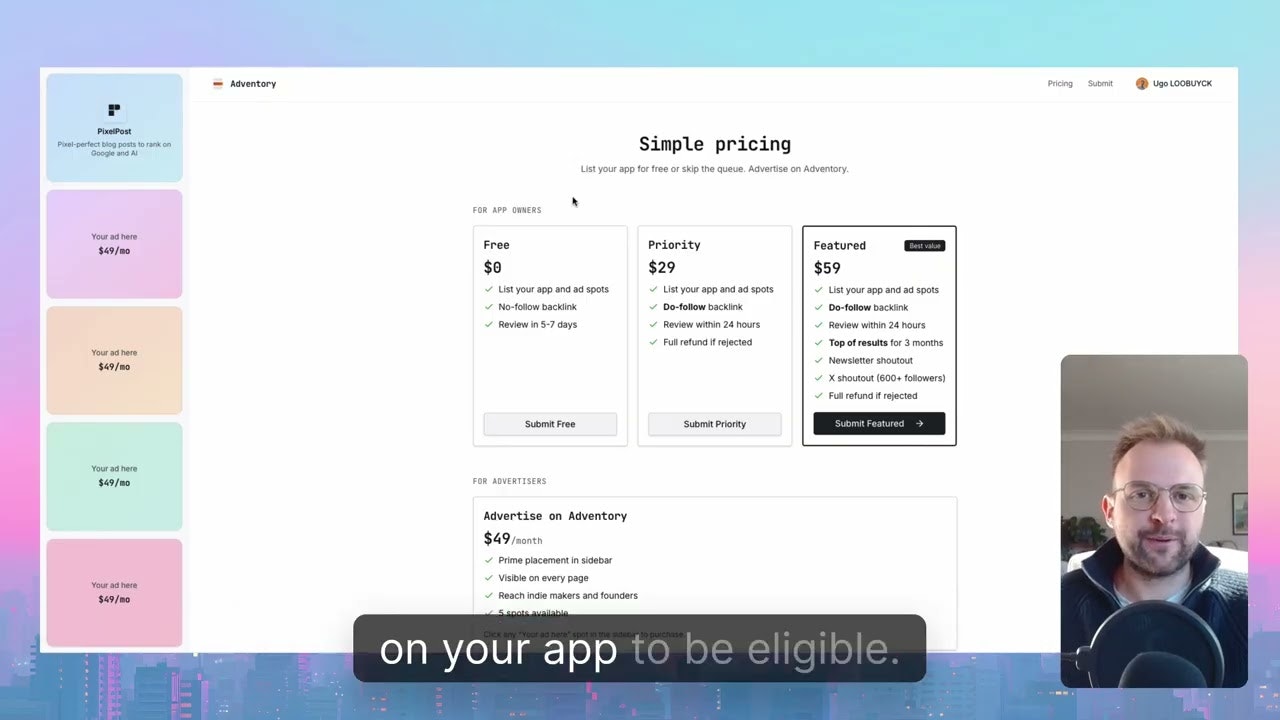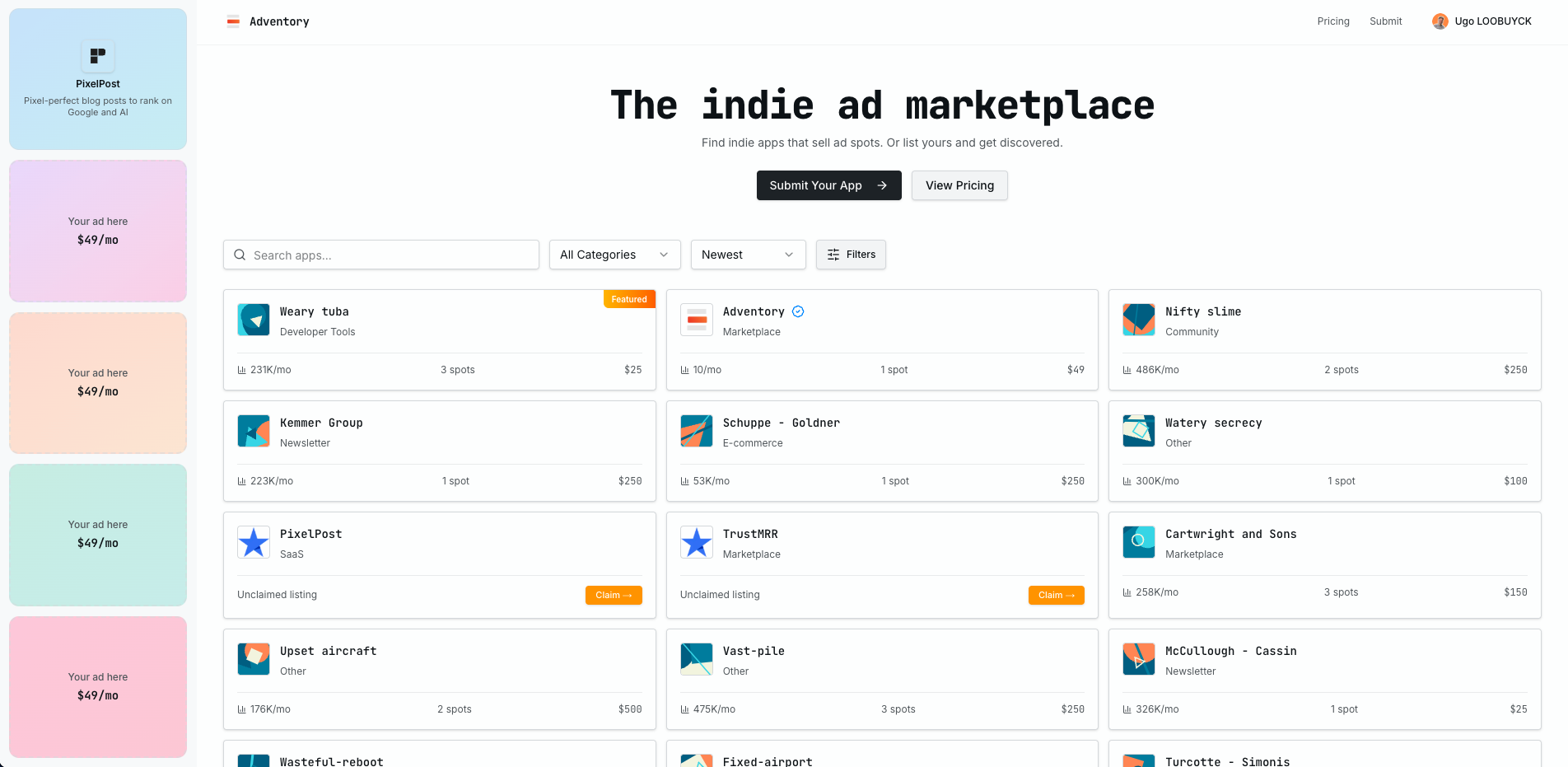 Find indie apps that sell ad spots. Or list yours and get discovered. ## For app owners - List your app that has ad spots to sell - Get discovered by hundreds of SaaS founders - Get your app featured to appear on top of browsing results - Get a free backlink to boost your SEO ## For advertisers - Browse hundreds of apps that sell ad spots - Find the perfect spot to advertise your product - Review app analytics directly on our platform Looking to buy or sell ad space? Check out Adventory!