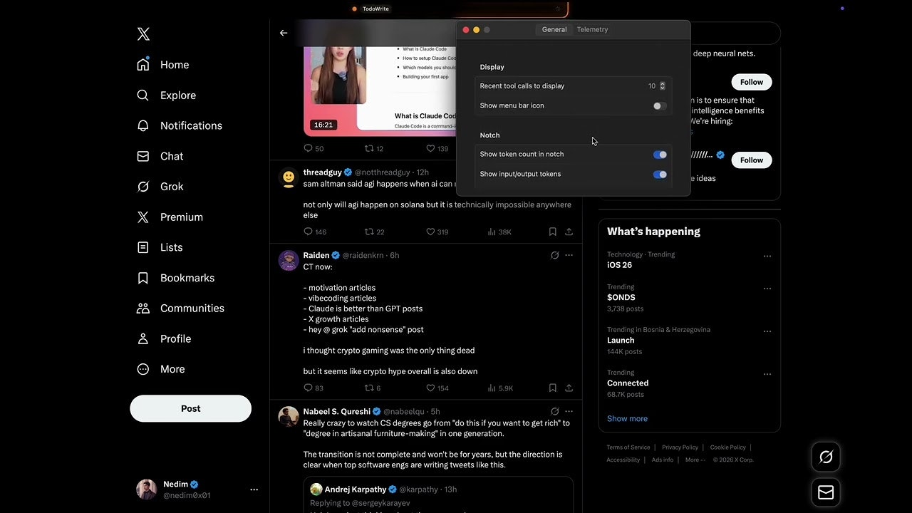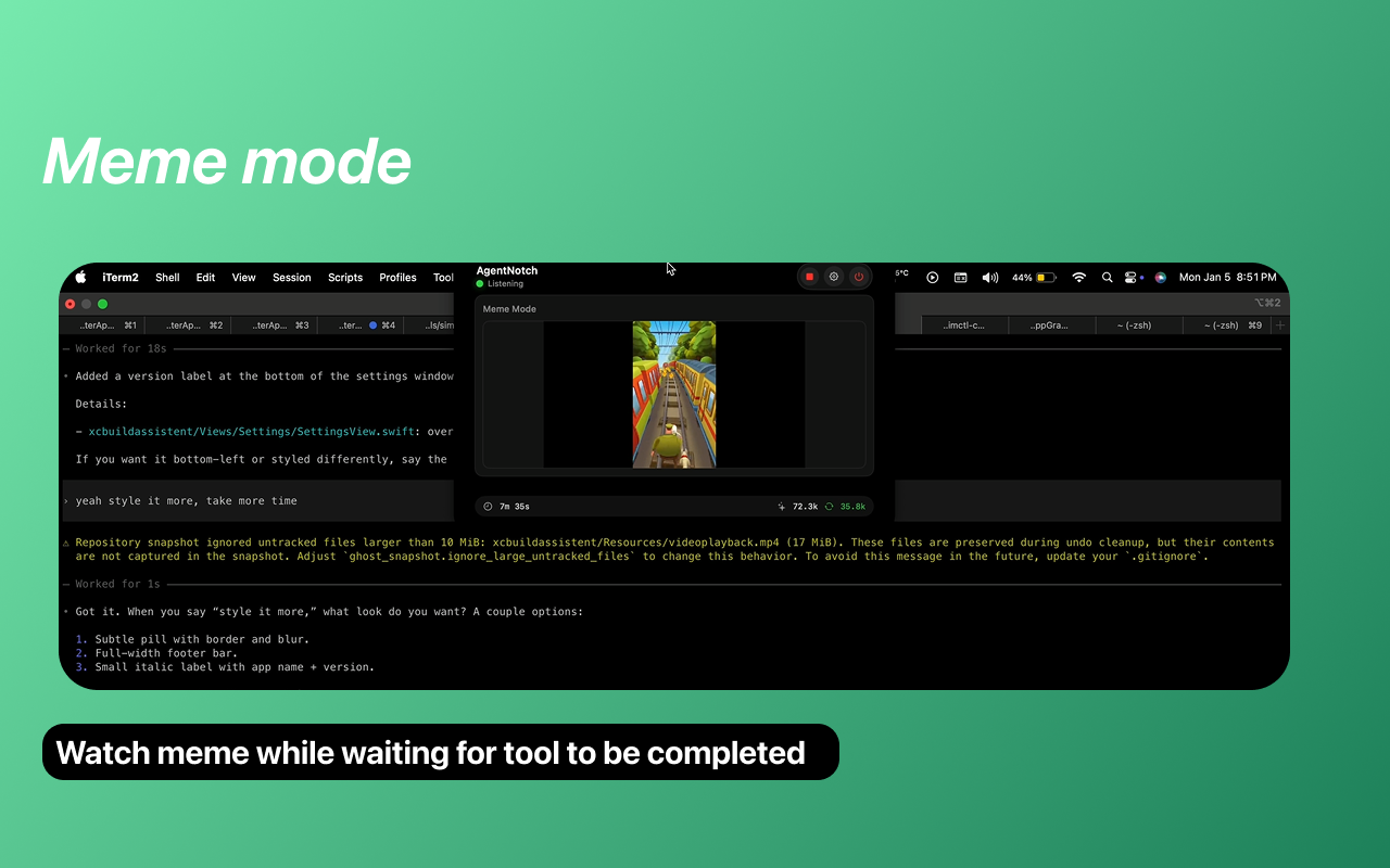 AgentNotch is a macOS menu bar app that lives in your Mac's notch, providing real-time visibility into your AI coding assistants. Watch as Claude Code and OpenAI Codex think, read files, and execute tools while you do other tasks. Install via Brew, and follow guide on Github to setup telemetry for CC and Codex. brew tap AppGram/tap brew install --cask agentnotch