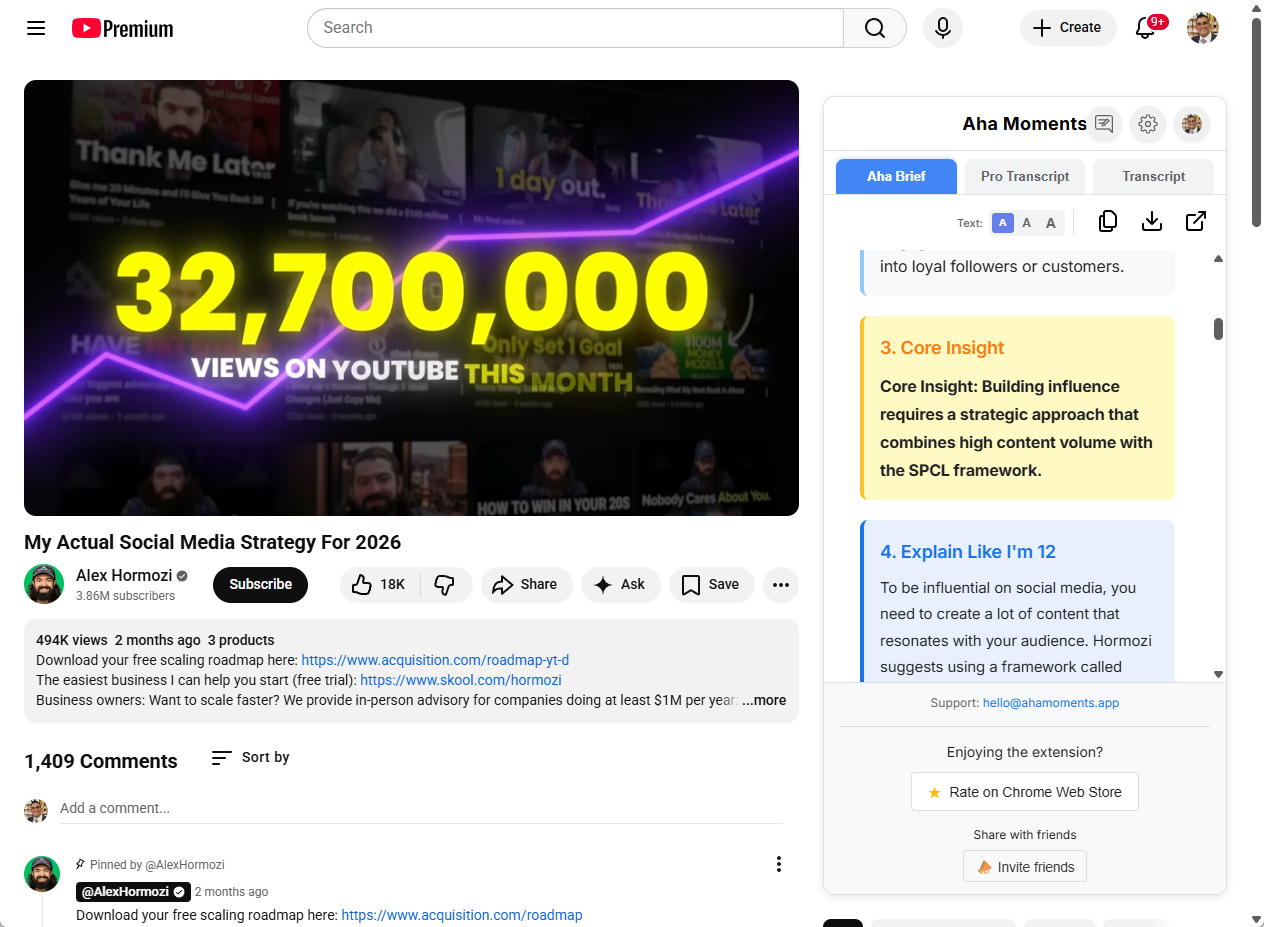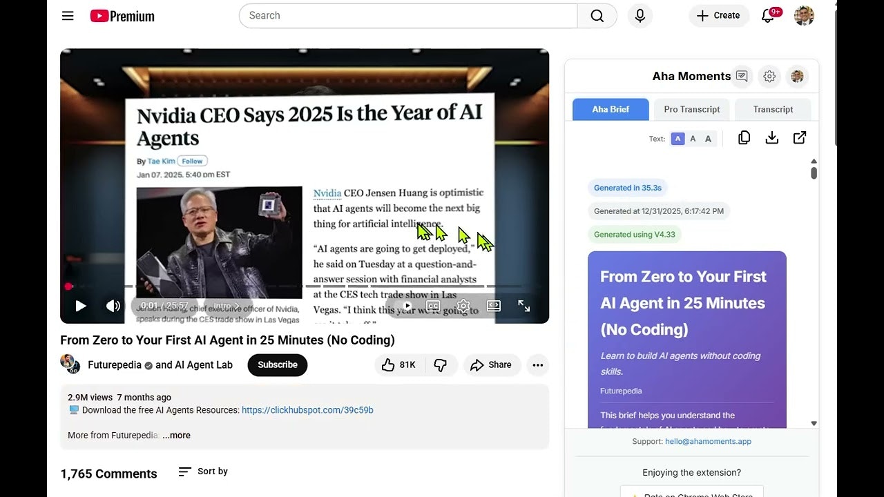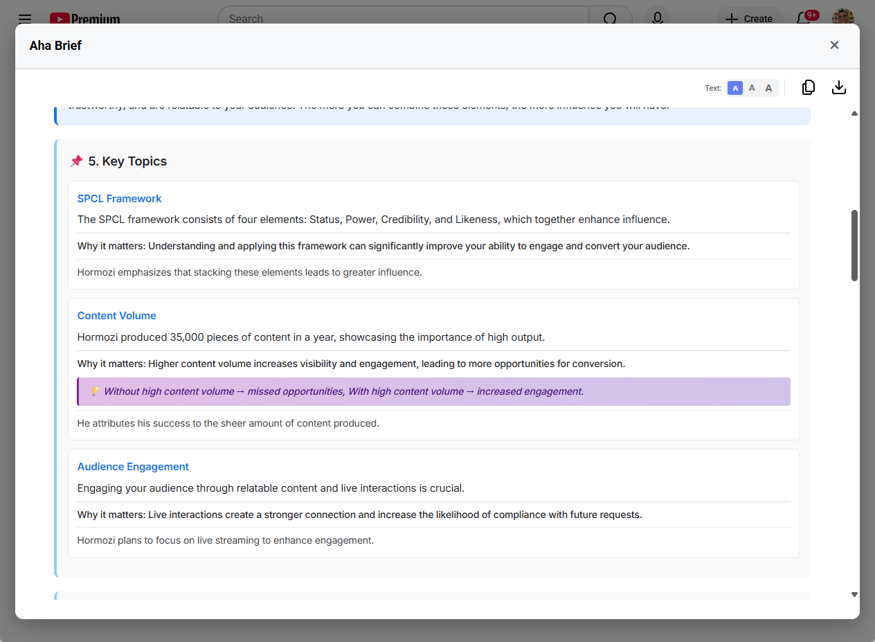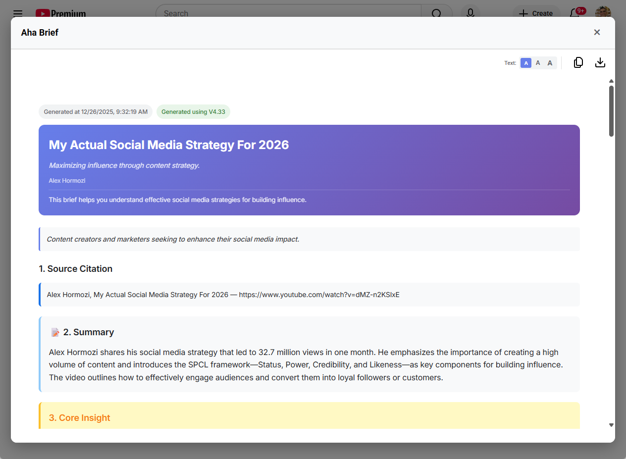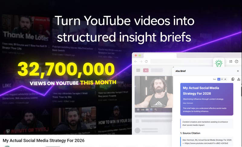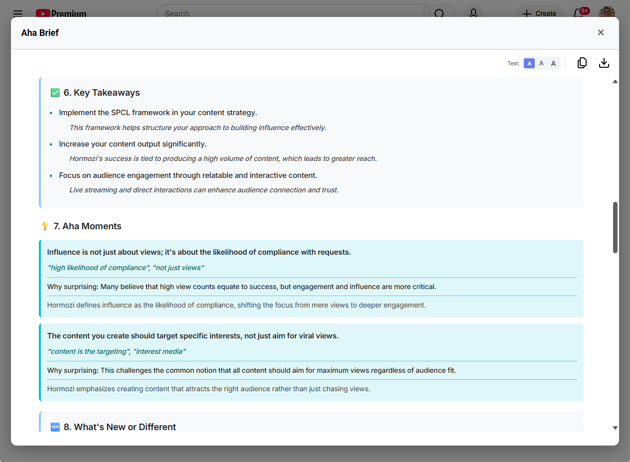 Turn YouTube videos into structured insight briefs with key ideas, takeaways, and next steps so you can actually apply what you watch. Aha Moments is a Chrome extension that works while watching or after a video. One click. Consistent format. A free tier is available.