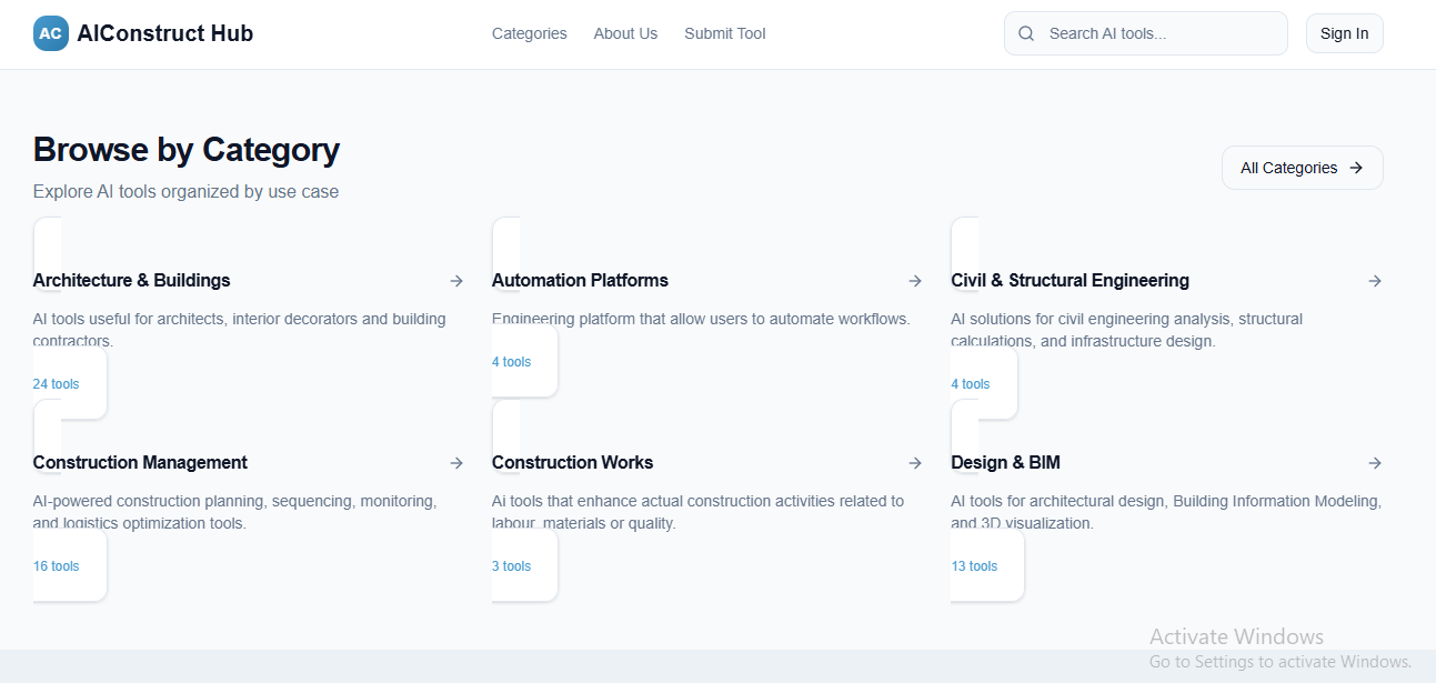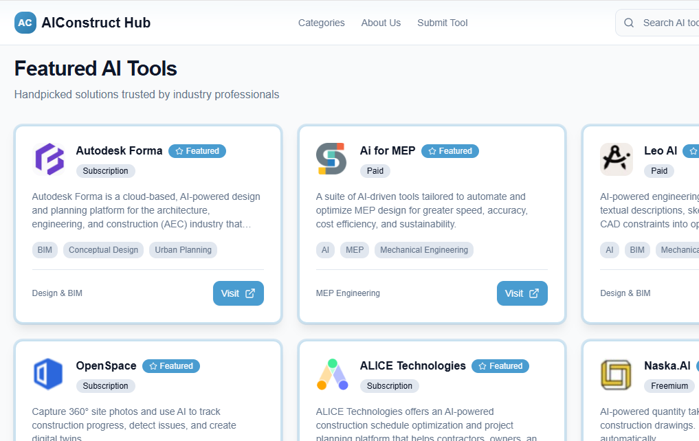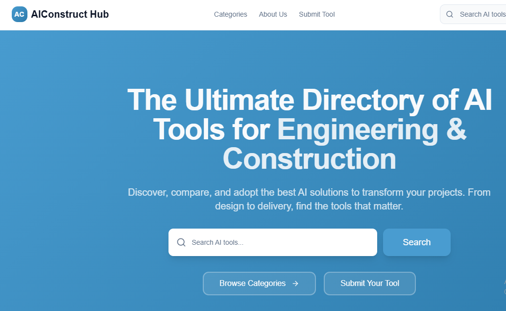 AI Construct Hub is a comprehensive digital directory and resource platform specifically curated for artificial intelligence tools in the construction industry. The site creates a comprehensive category for the apps to help professionals stay updated on emerging technologies. It serves as a central hub for contractors and engineers to discover, compare, and implement AI-driven solutions to improve project efficiency and safety.