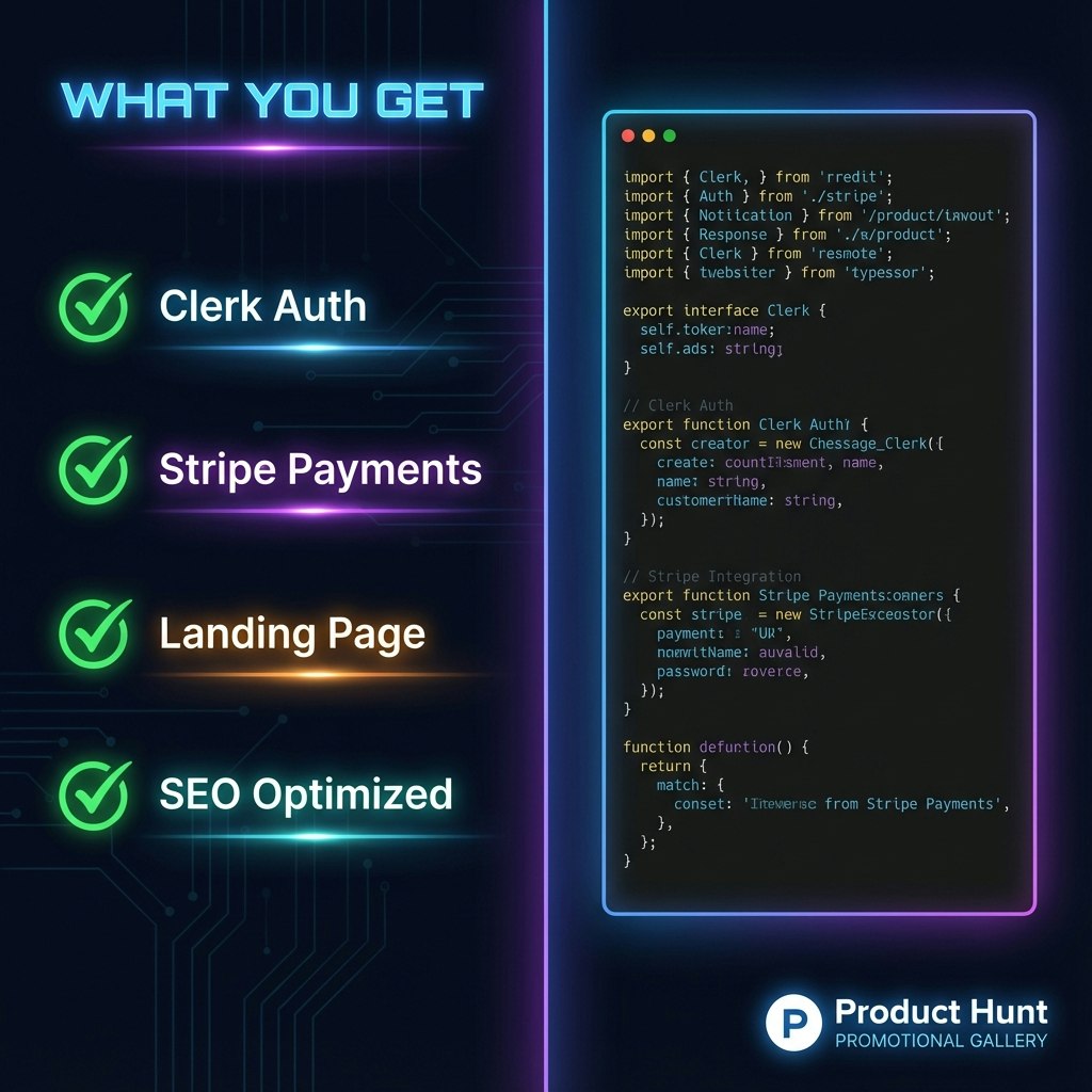 The no-fluff Next.js starter kit. Auth, payments, and marketing pages pre-configured. Stop configuring, start shipping.