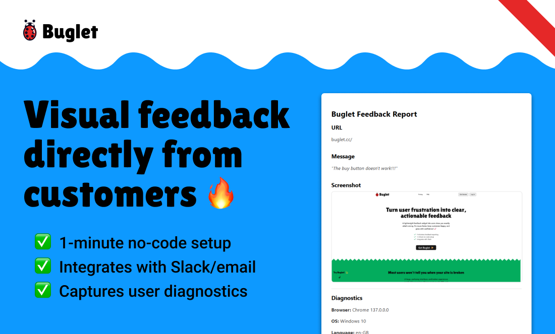 Buglet is a lightweight, no-code widget for capturing visual bug reports directly from your users. Fast setup, clear feedback, happier customers.