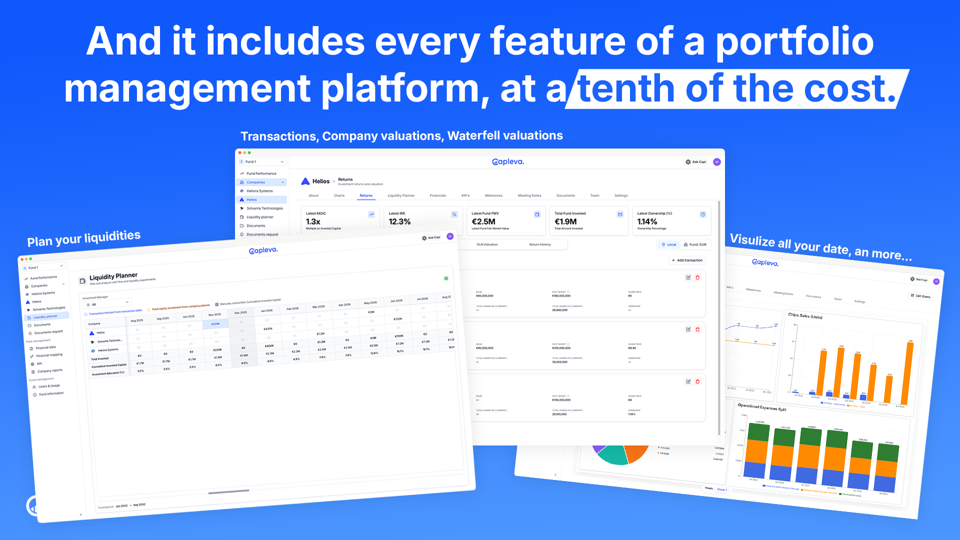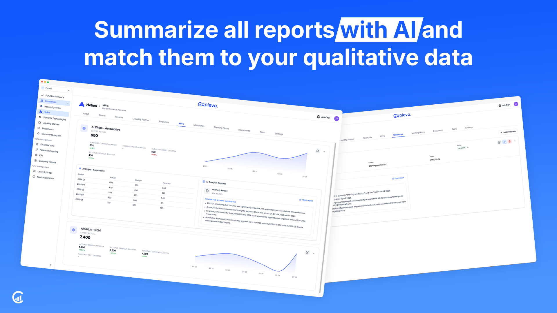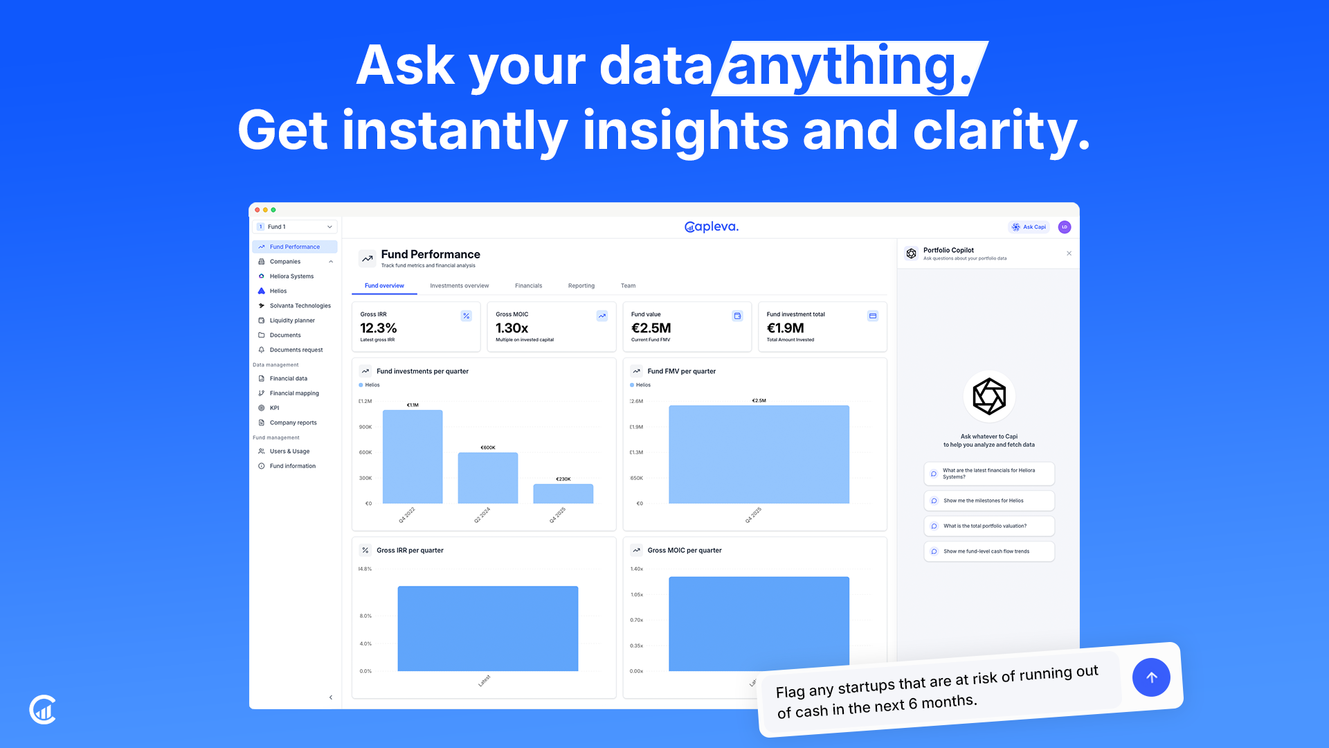 Capleva centralizes your entire VC operations in one workspace. Upload your data and AI instantly extracts IRR, MOIC, and key metrics. No more messy spreadsheets or scattered tools. Unify portfolio data, documents, dashboards, and memos with a clear, secure, automated workflow. Capleva removes the productivity tax so VCs can focus on what matters most: investing.