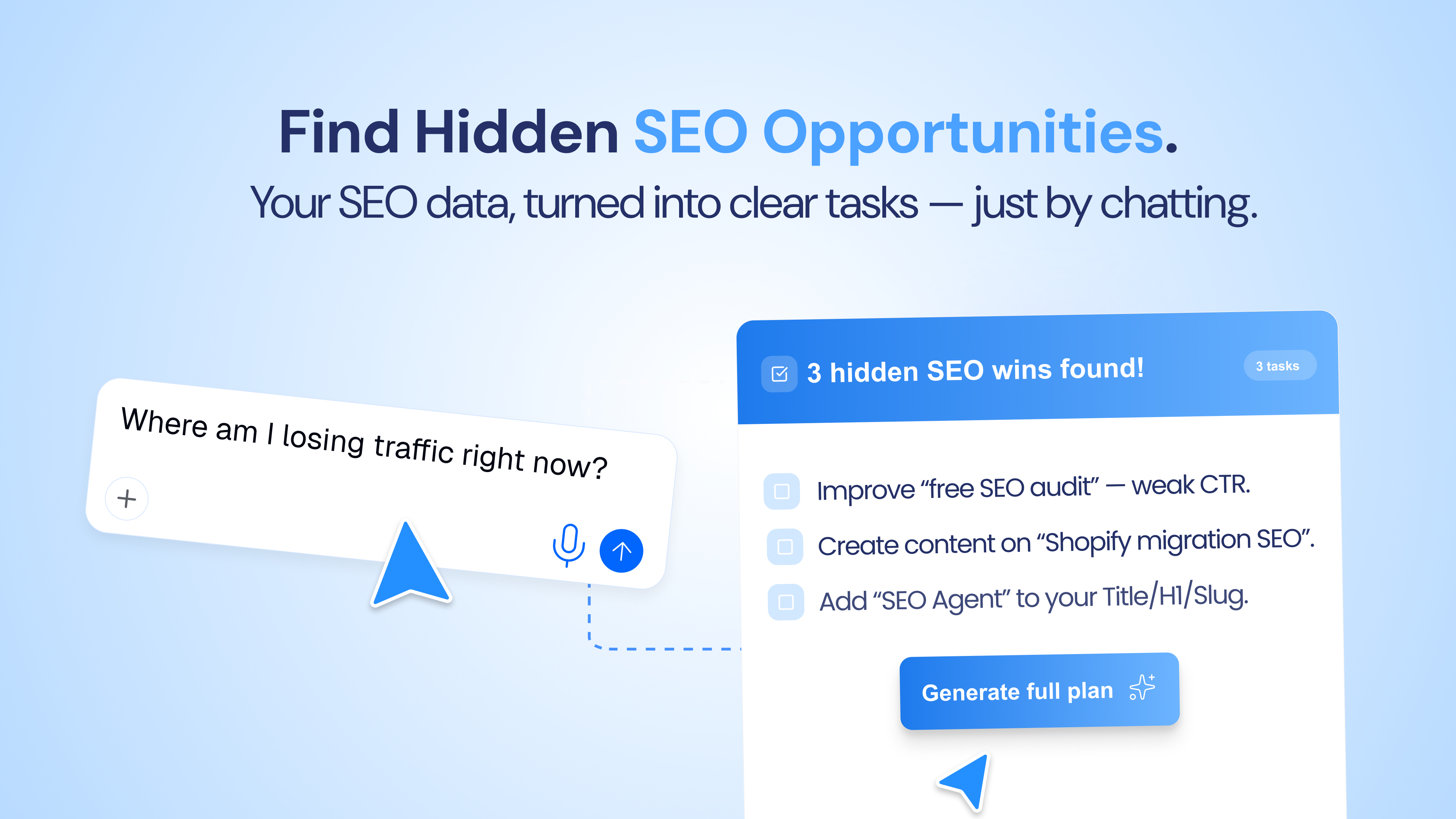 The all-in-one SEO tool that connects to your Google Search Console and market data. Just ask any question and get clear, actionable next steps to grow your traffic in Google and AI search.