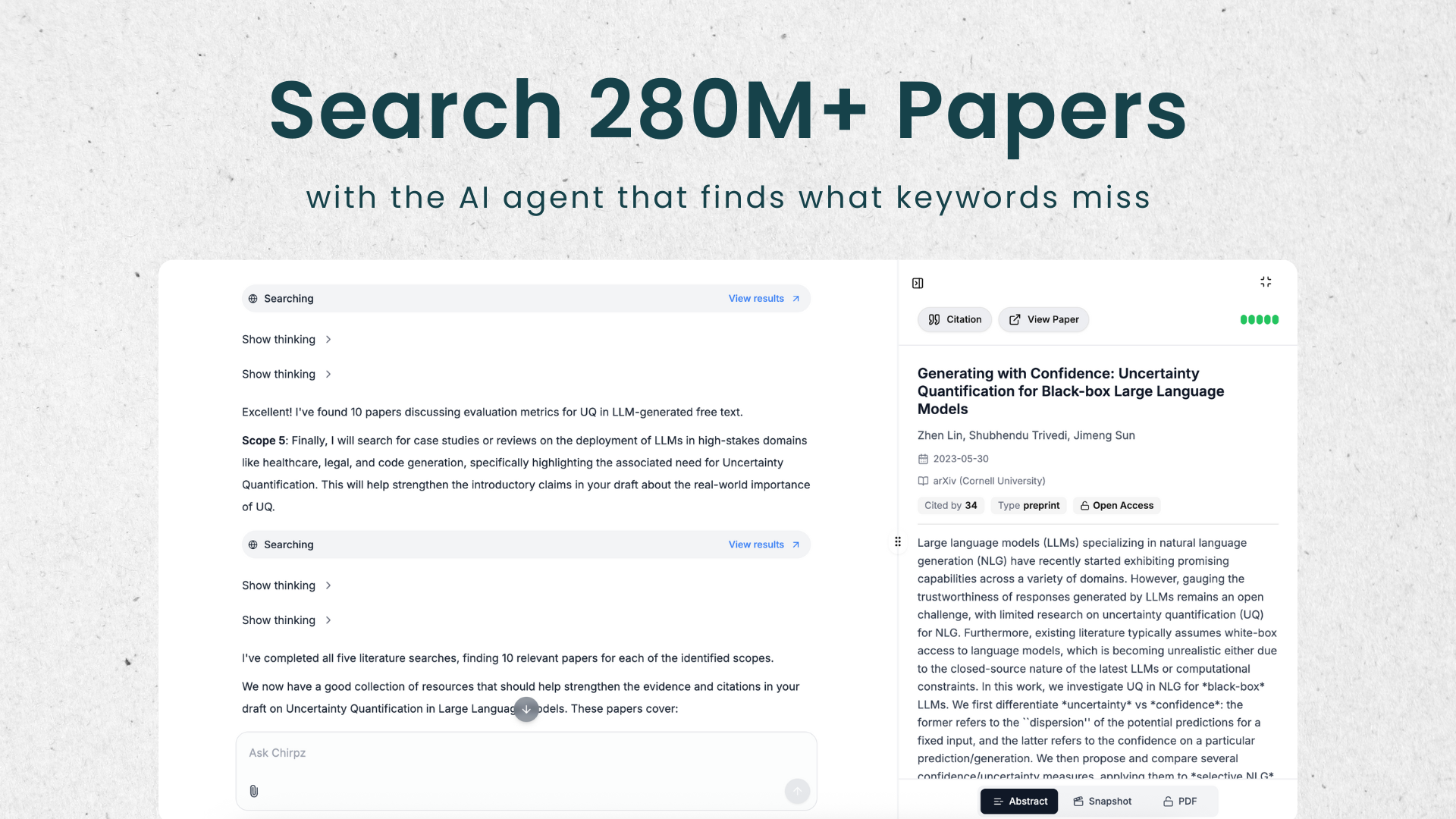 Chirpz agent is the smartest way to find, prioritize, read, and cite academic papers. It understands your context and searches 280M+ papers across major academic databases. It ranks the most relevant work, generates instant summaries, and provides trusted citations — all in one place.