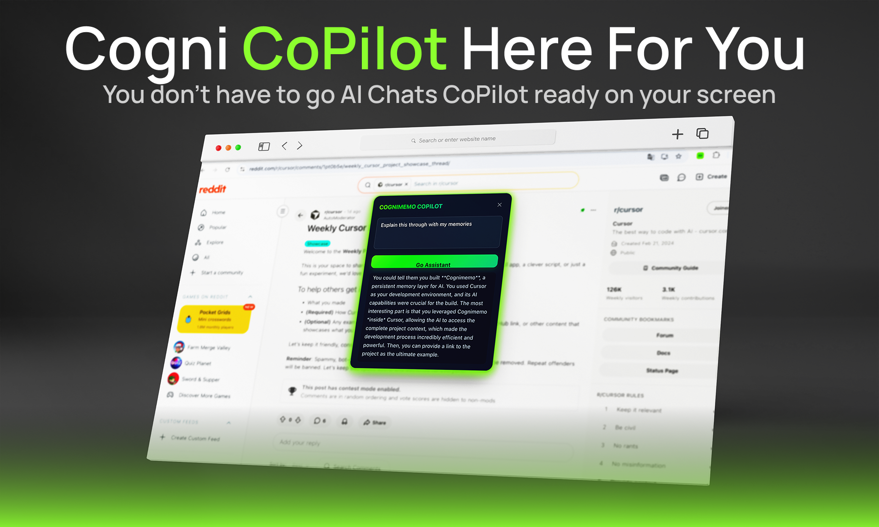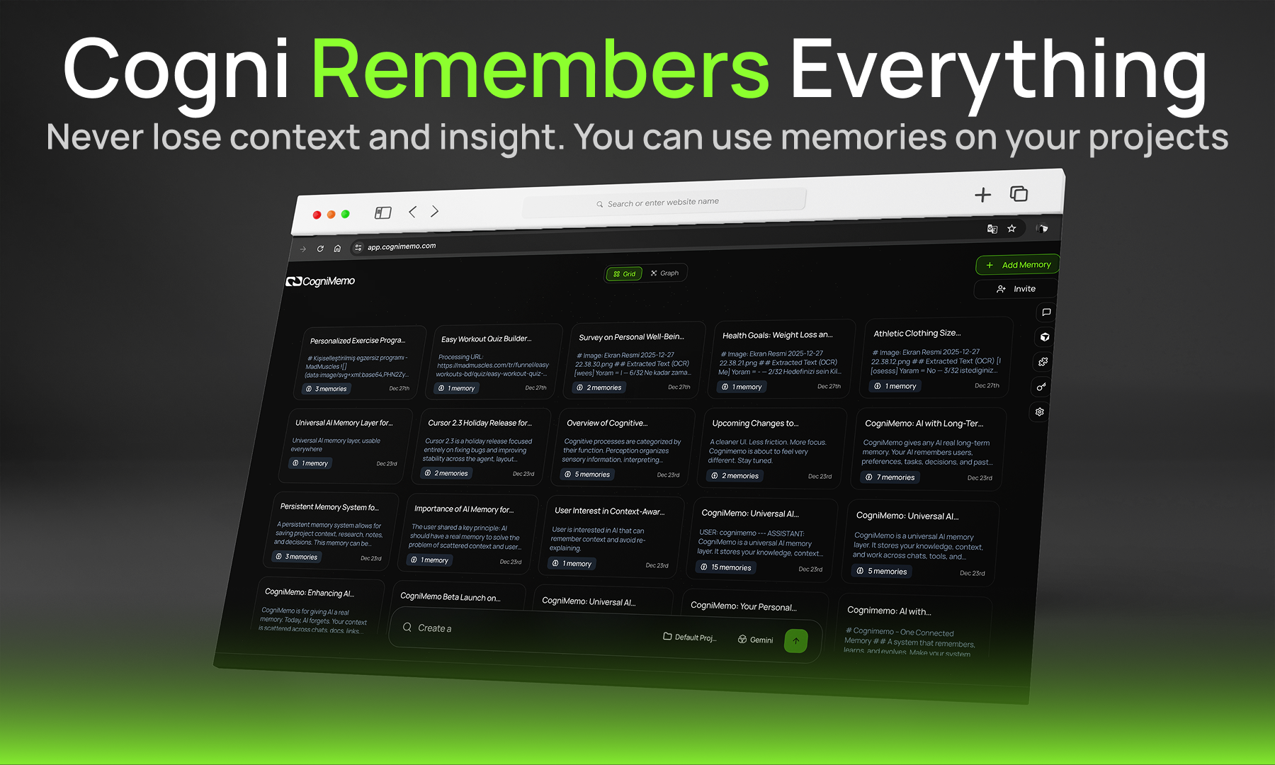 CogniMemo helps your AI remember. It adds long-term memory to ChatGPT and other AI tools. You can type @cogni in any chat to search your saved notes, past chats, and content. It works with ChatGPT, Claude, Gemini, and DeepSeek. You can save posts from X/Twitter, archive your AI conversations, and use a floating assistant on any website to explain or write using your own knowledge. Everything stays organized in one fast, searchable place—and your data stays under your control.