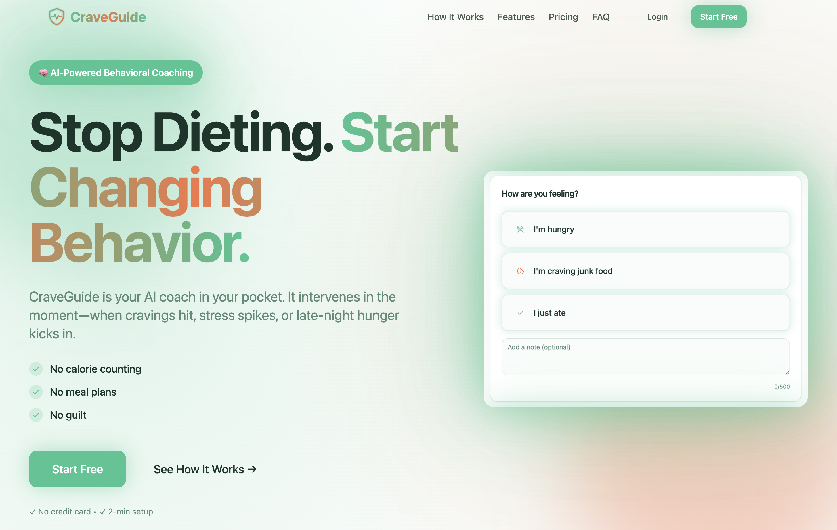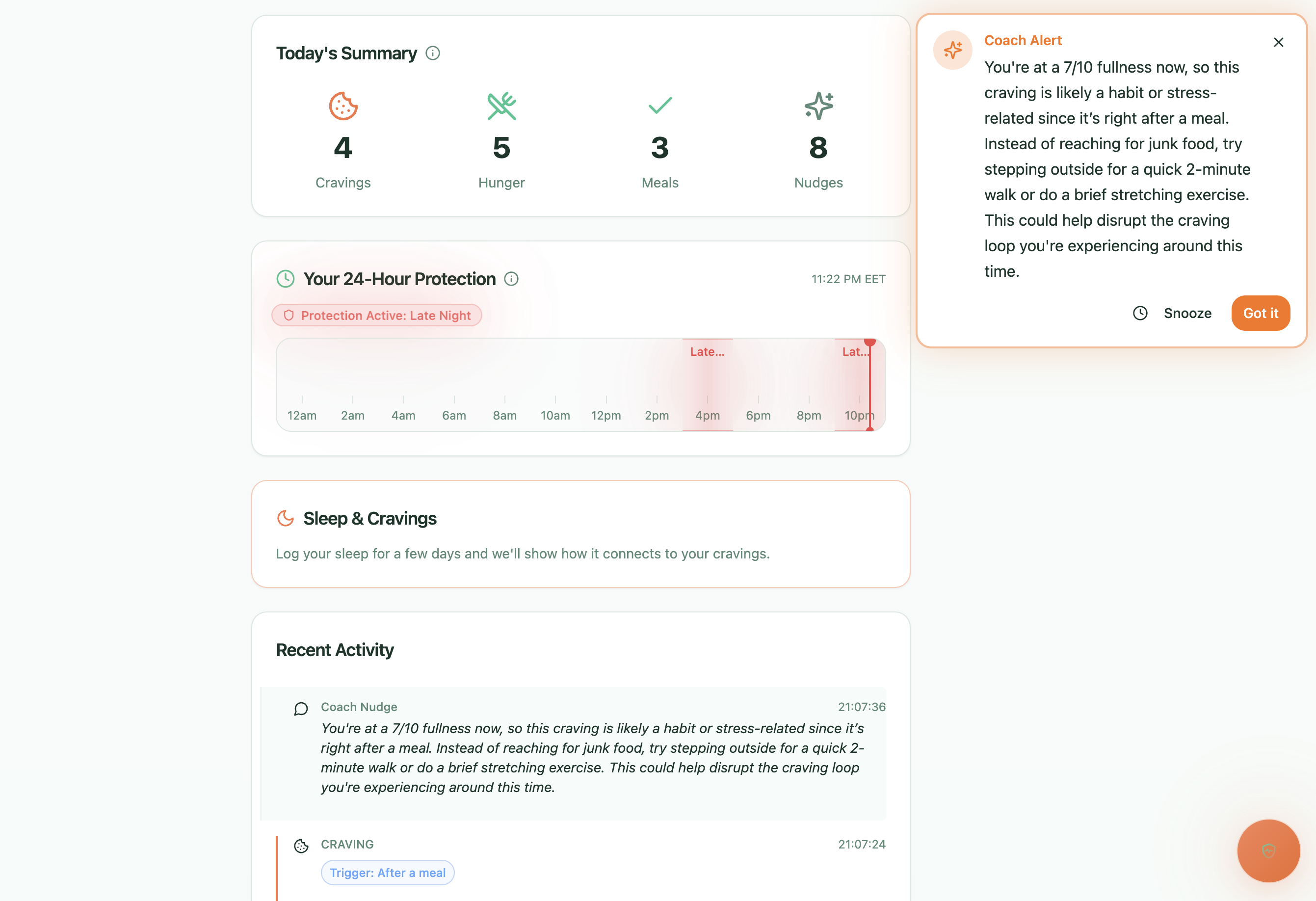 Most diets fail because they don't intervene when you actually need help. CraveGuide is a friction-free AI coach that helps you break habit loops in real-time. 🧠 No Calorie Counting: Just tap "I'm craving" or "I'm stressed" to get immediate, psychology-based nudges. 🛡️ Danger Windows: The AI learns your weak moments (like 9 PM snacking) and proactively checks in before you slip. Build awareness, not guilt.