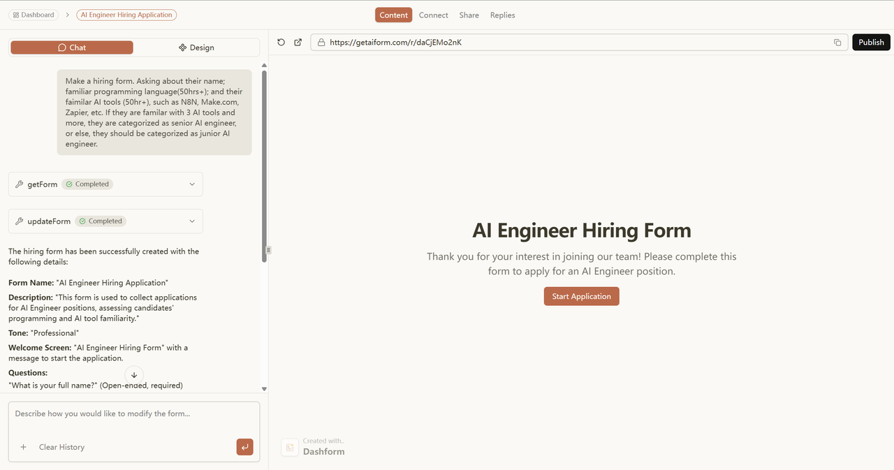 Over the past few months, we talked to founders, PMs, creators, and automators who all said something similar: “I build forms every week — why does it still take so many steps? Why isn’t there a faster, AI-native way?” So we built Dashform, a natural-language form builder where you simply describe what you want, and Dashform generates a fully functional form: fields → logic → validation → theming → integrations → publish link.