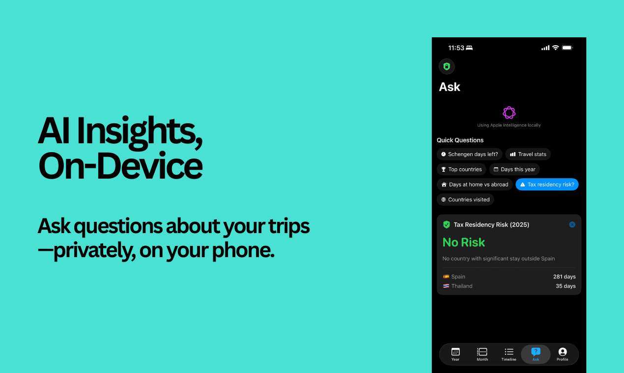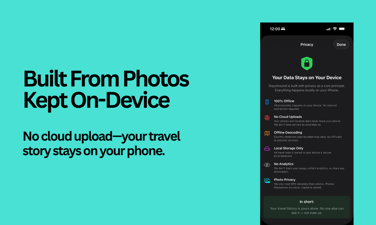 Resurface your favorite travel memories. Keep a beautiful log of where life has taken you. Get the data that matters — days per country for tax residency, visa warnings, Schengen limits. All from your iPhone photos, scanned locally. Nothing ever uploaded.