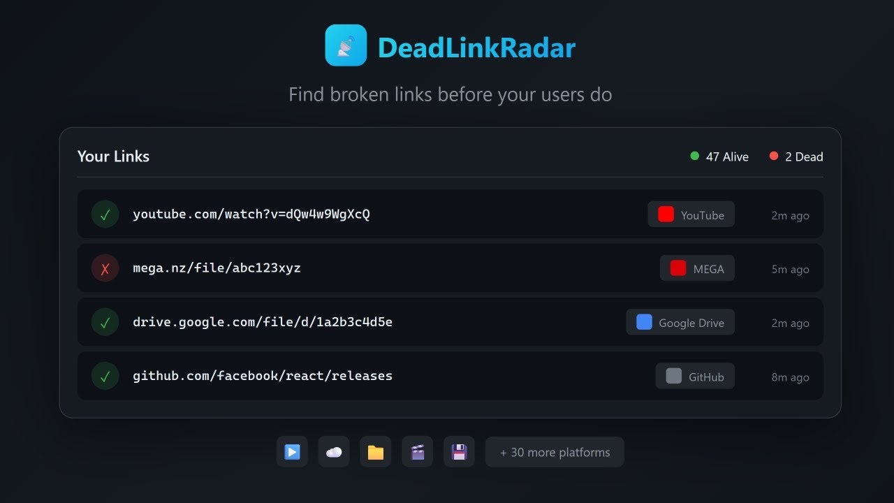 DeadLinkRadar monitors any URL 24/7 and alerts you when links break. Unlike basic uptime monitors, we have deep integrations for 30+ platforms—YouTube, file hosts, cloud storage—catching "soft" failures that return 200 OK but are actually dead. ✓ Monitor any URL ✓ 15-minute checks ✓ Email alerts ✓ REST API ✓ Free tier Built for creators and developers tired of finding out about broken links from angry users.