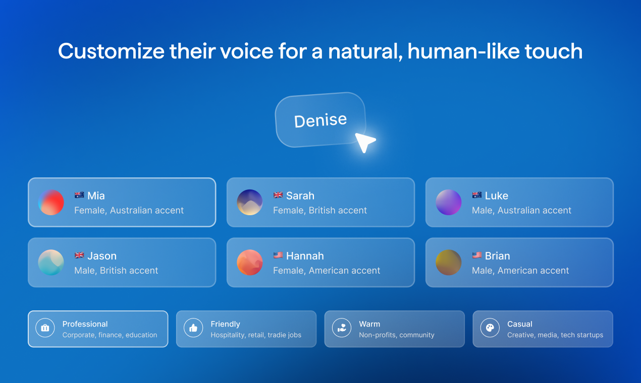 Denise is an AI receptionist built for small business and answers calls with a natural, human-like touch. Setup is simple: Choose from 6 voices and 4 tone styles, control how Denise responds, and sync with 8000+ apps via Zapier. With 24/7 and multiple call handling, Denise ensures you save time on admin and never miss a call again.