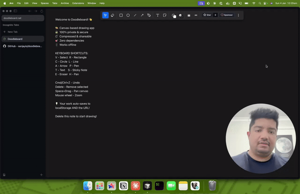 Doodleboard is a minimalist drawing app that runs entirely in your browser. No servers, no accounts, no tracking—your data never leaves your machine. Draw rectangles, circles, arrows, freehand sketches, text boxes, and sticky notes. Everything auto-saves to localStorage and compresses into the URL hash using deflate, so sharing your canvas is as simple as copying a link. Built as a single HTML file with zero dependencies. Works offline as a PWA. Fully open source—audit every line in minutes.