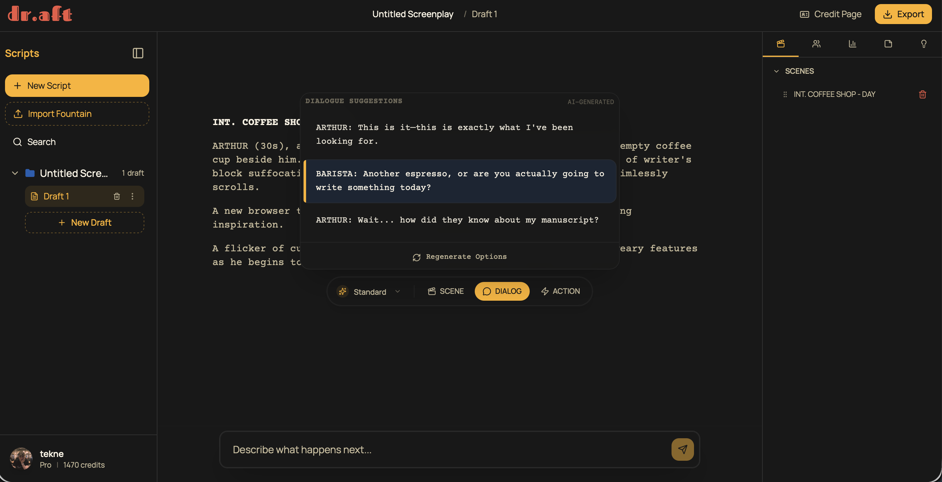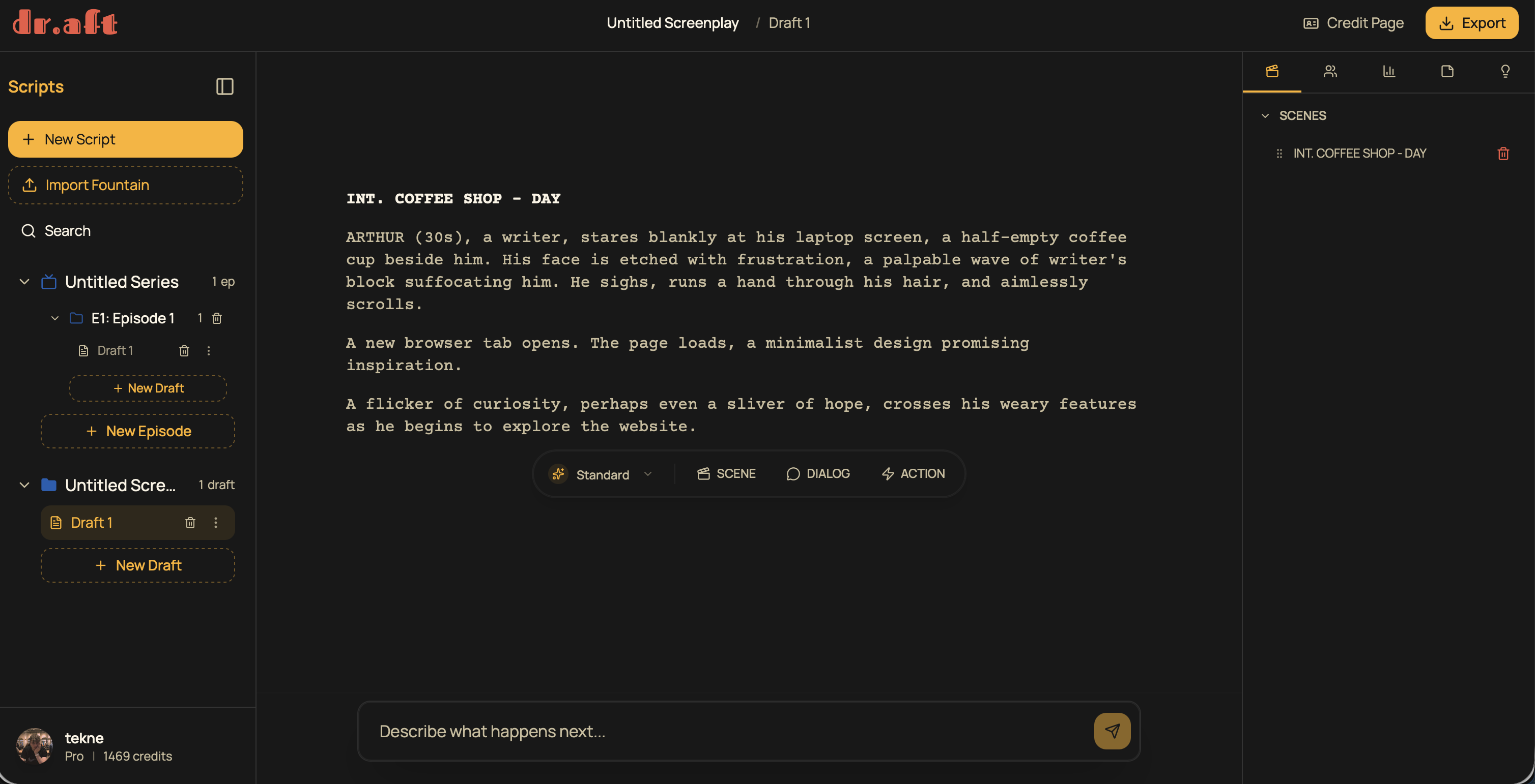 dr.aft is Cursor for screenwriters. An AI-powered screenwriting editor that understands Fountain and never breaks your format. It generates suggestions inline, respects industry-standard ".fountain" structure, and keeps every page production-ready. Custom style steering, distraction-free writing, and full BYOK support included. The kind of tool Christopher Moltisanti would’ve killed for.