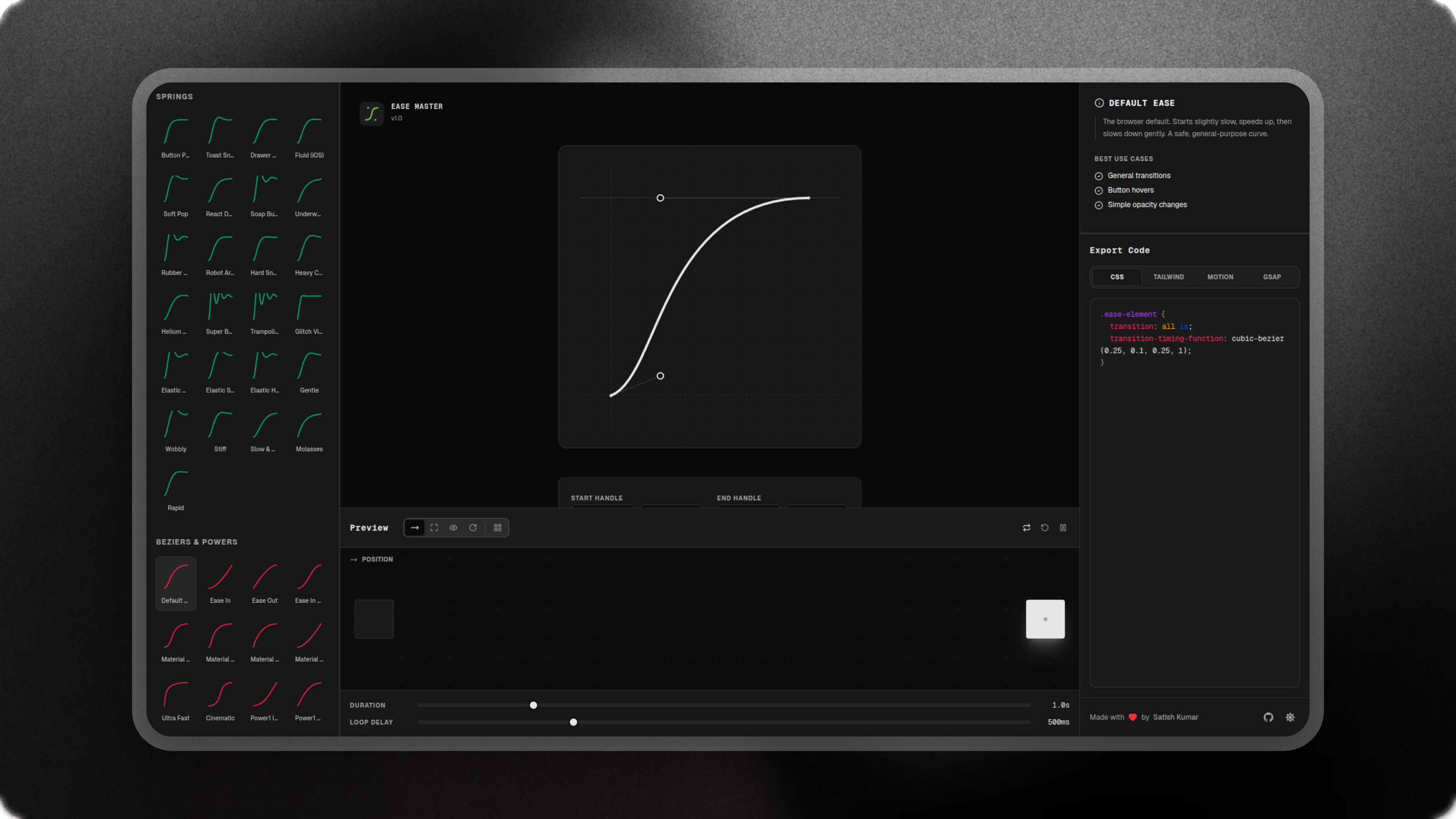 The ultimate easing visualization tool for generating Cubic Bezier curves and Spring physics for CSS, Tailwind, Framer Motion, and GSAP.