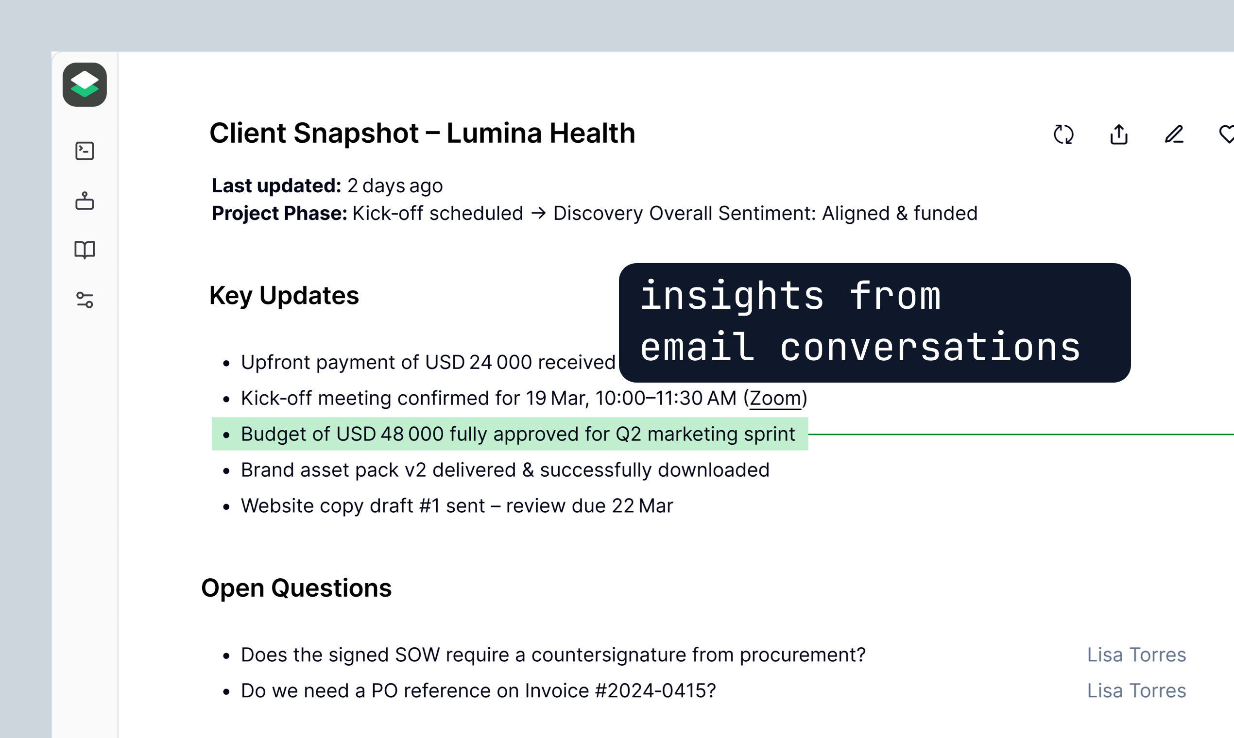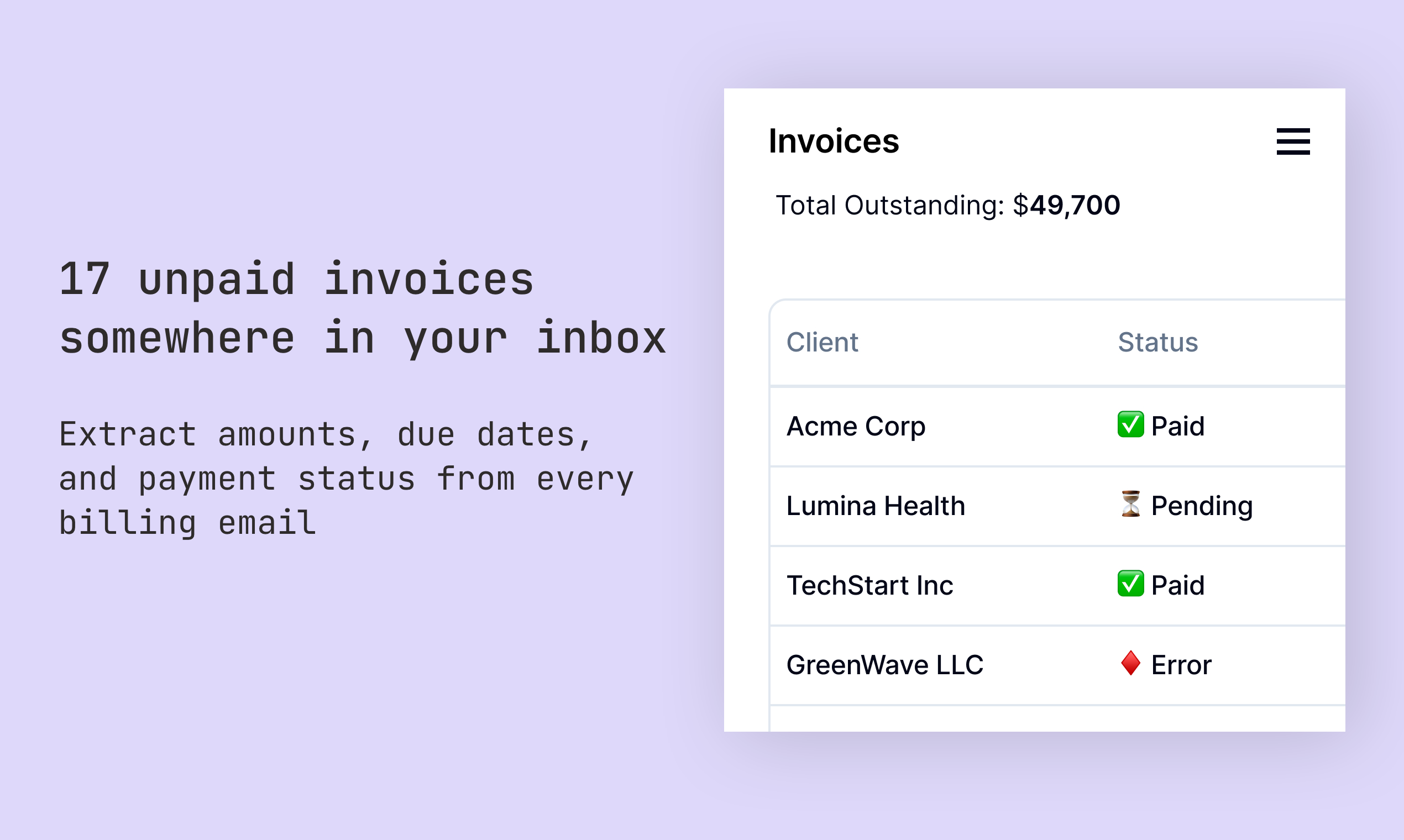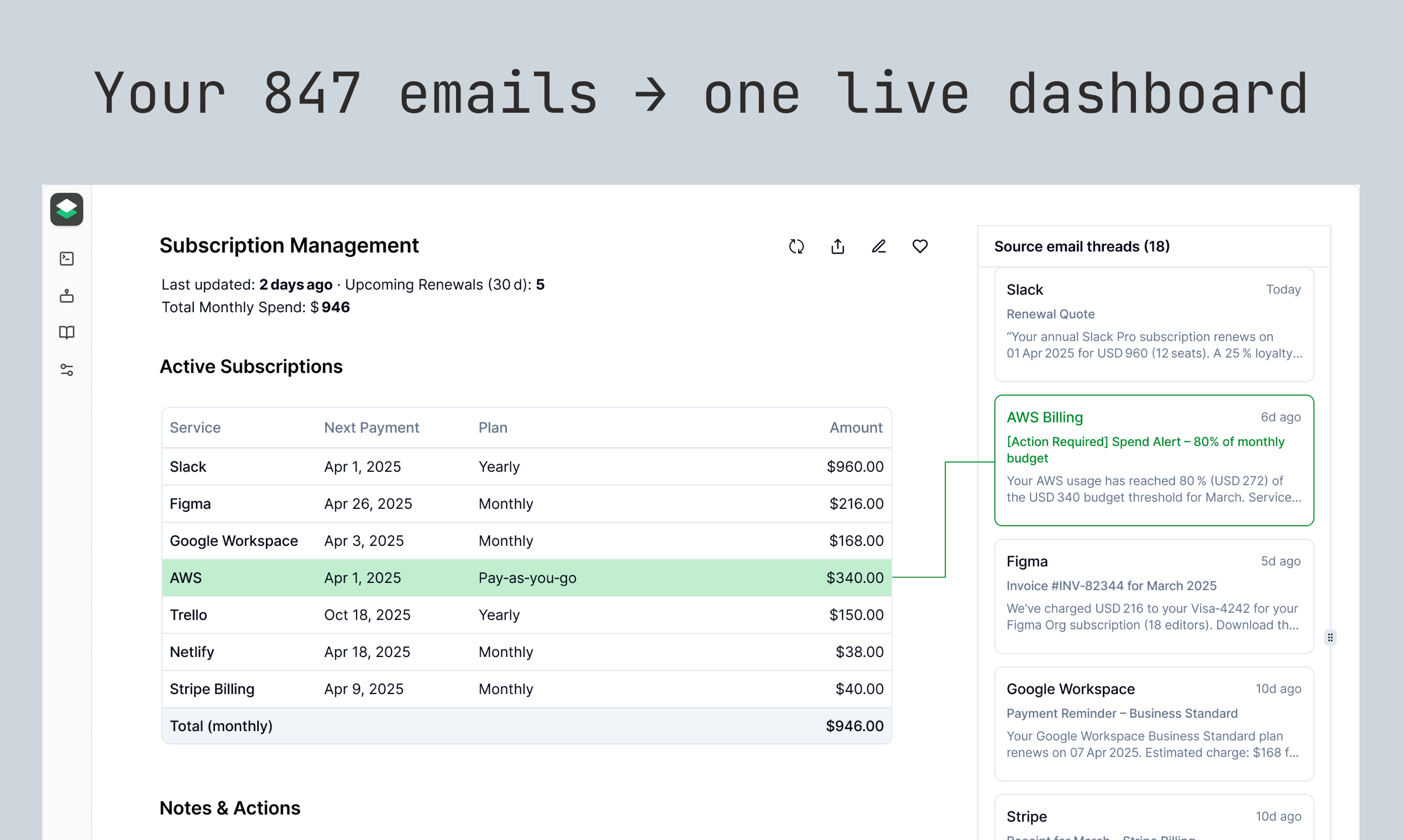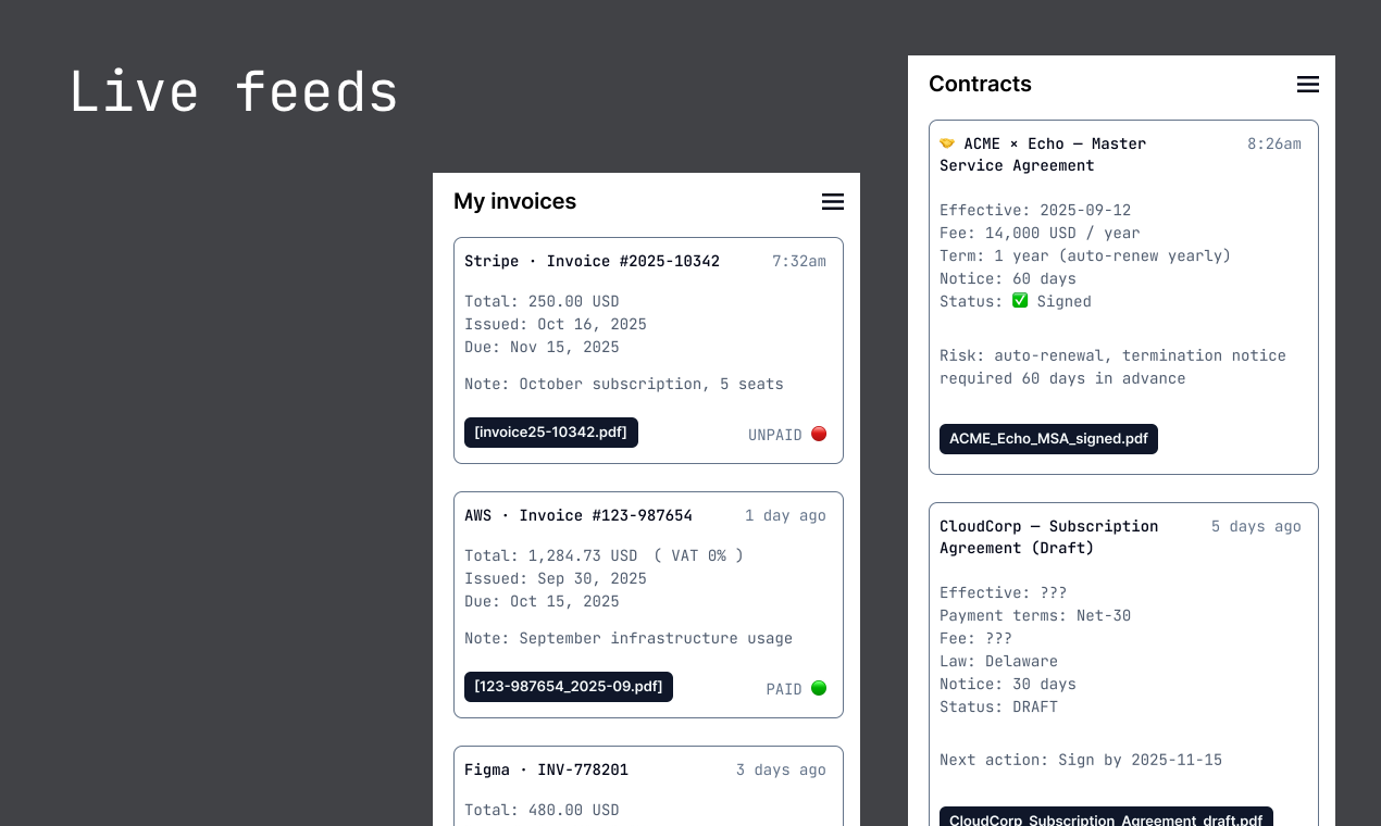Your inbox already contains everything about your work and life: contracts, client conversations, invoices, travel plans, deadlines, etc. Echo builds live dashboards from your email traffic. Extract invoice totals, catch contract renewals, find client projects, track job applications, spot AWS cost anomalies, etc.