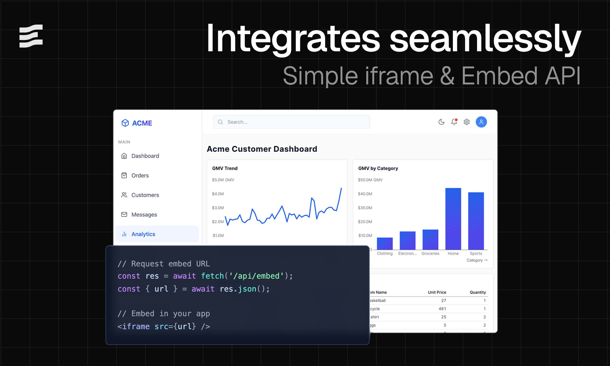 Data teams already treat queries, models, and transformations as code. Yet embedded analytics is often built in drag-and-drop BI tools, without version control or reliable deployment workflows. That’s a poor fit for one of your most critical, customer-visible data products. Embedded analytics in Evidence introduces a code-first way to build customer reporting that fits seamlessly in your app - and can be owned entirely by the data team.