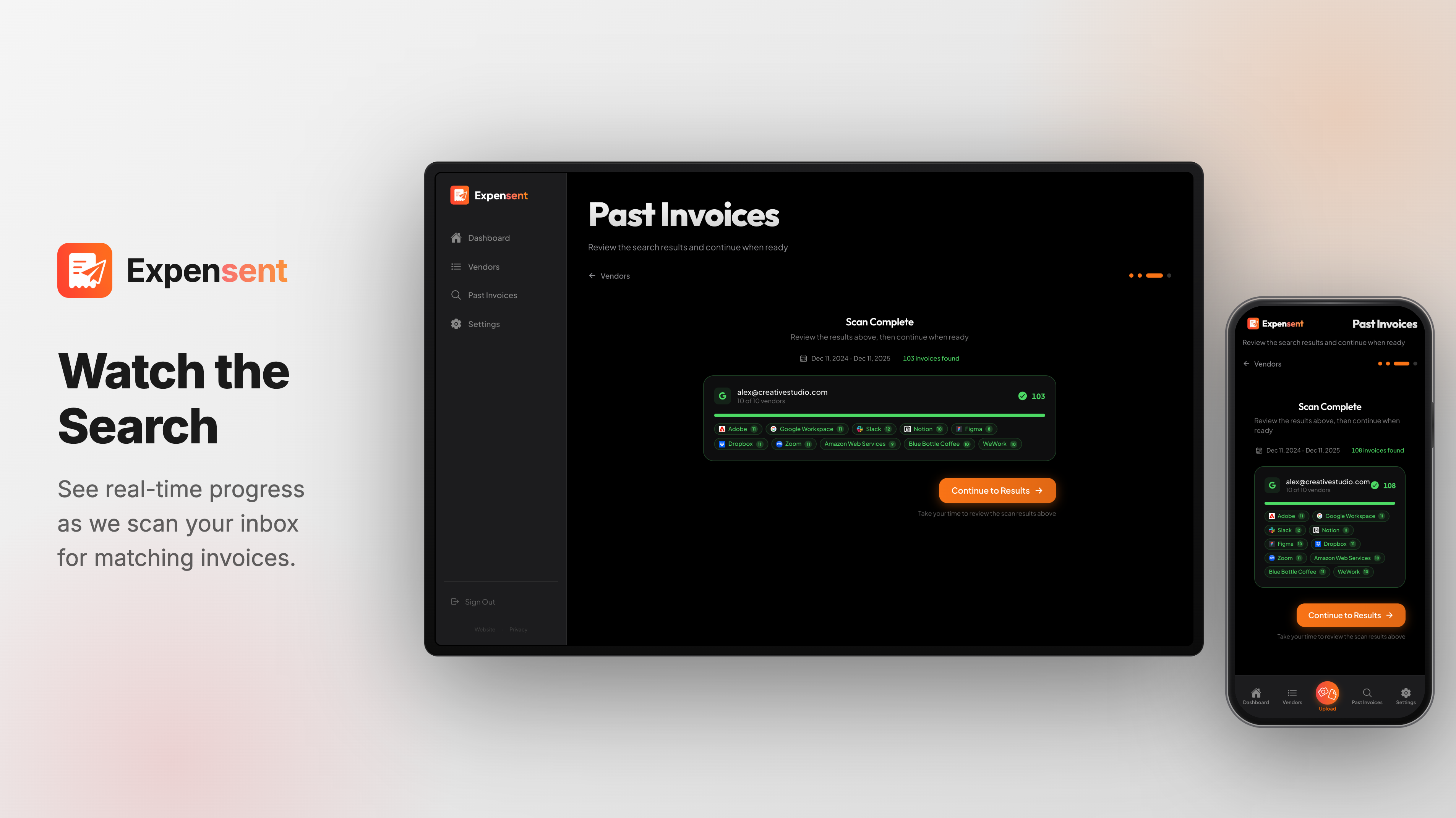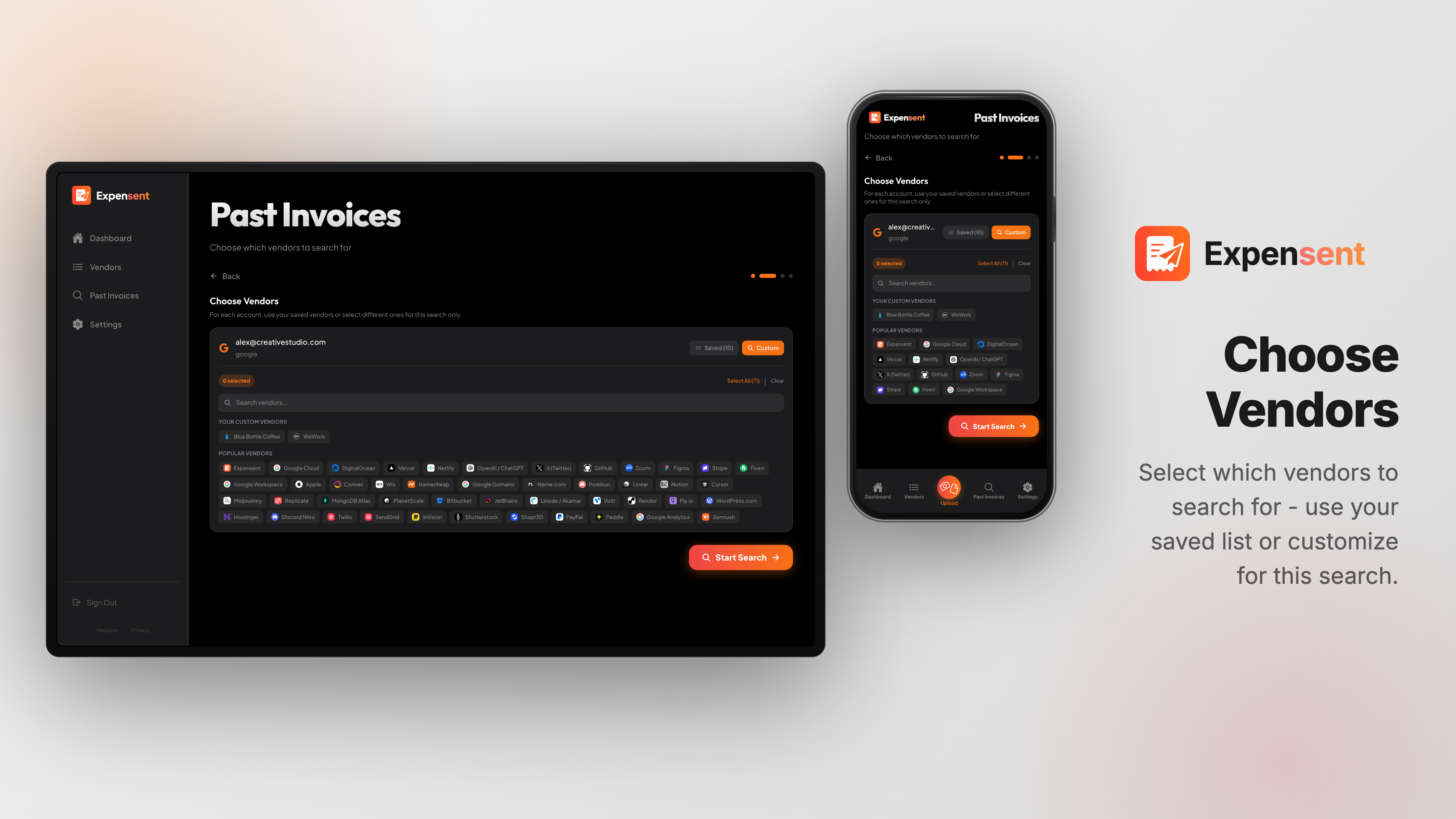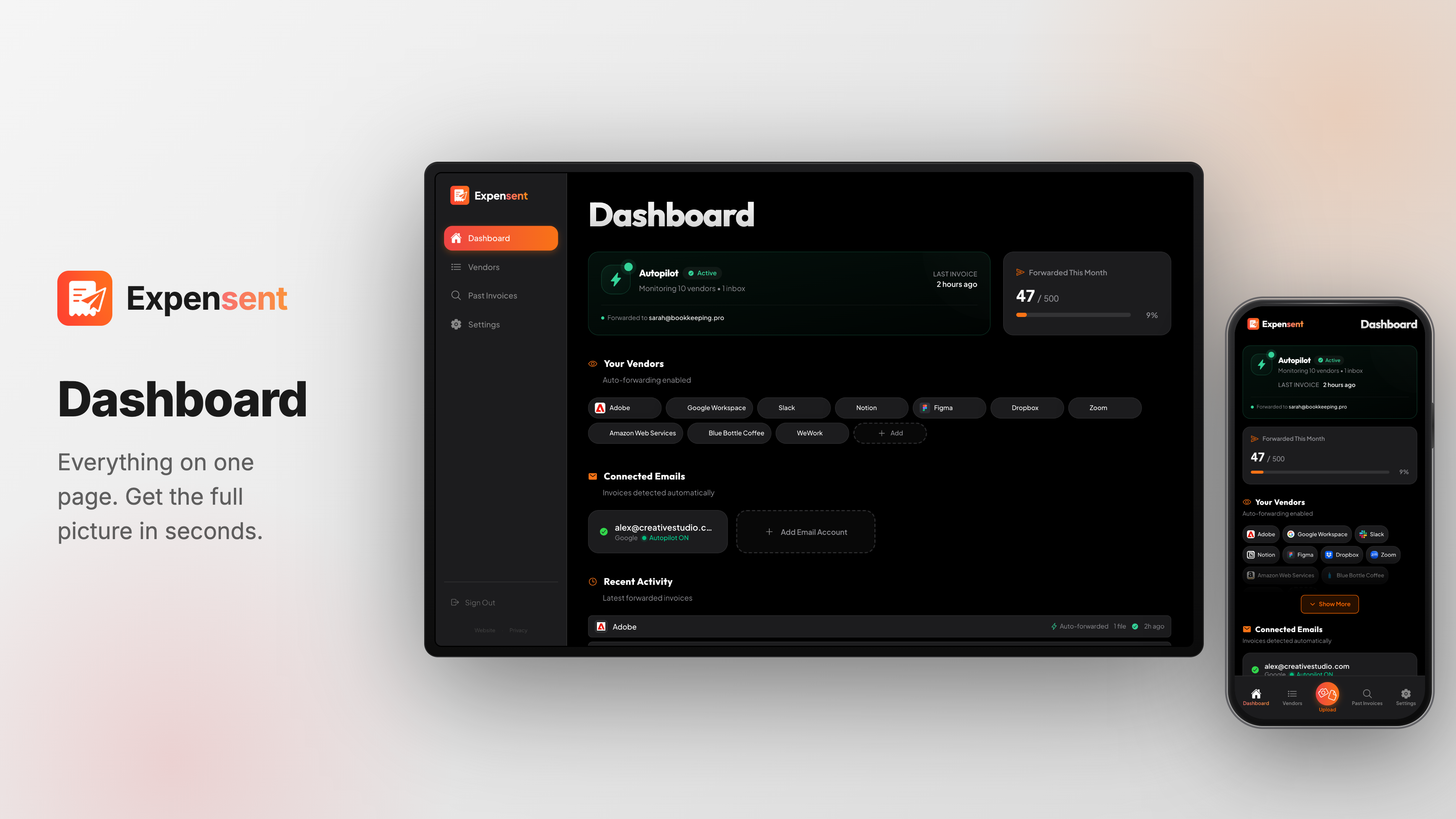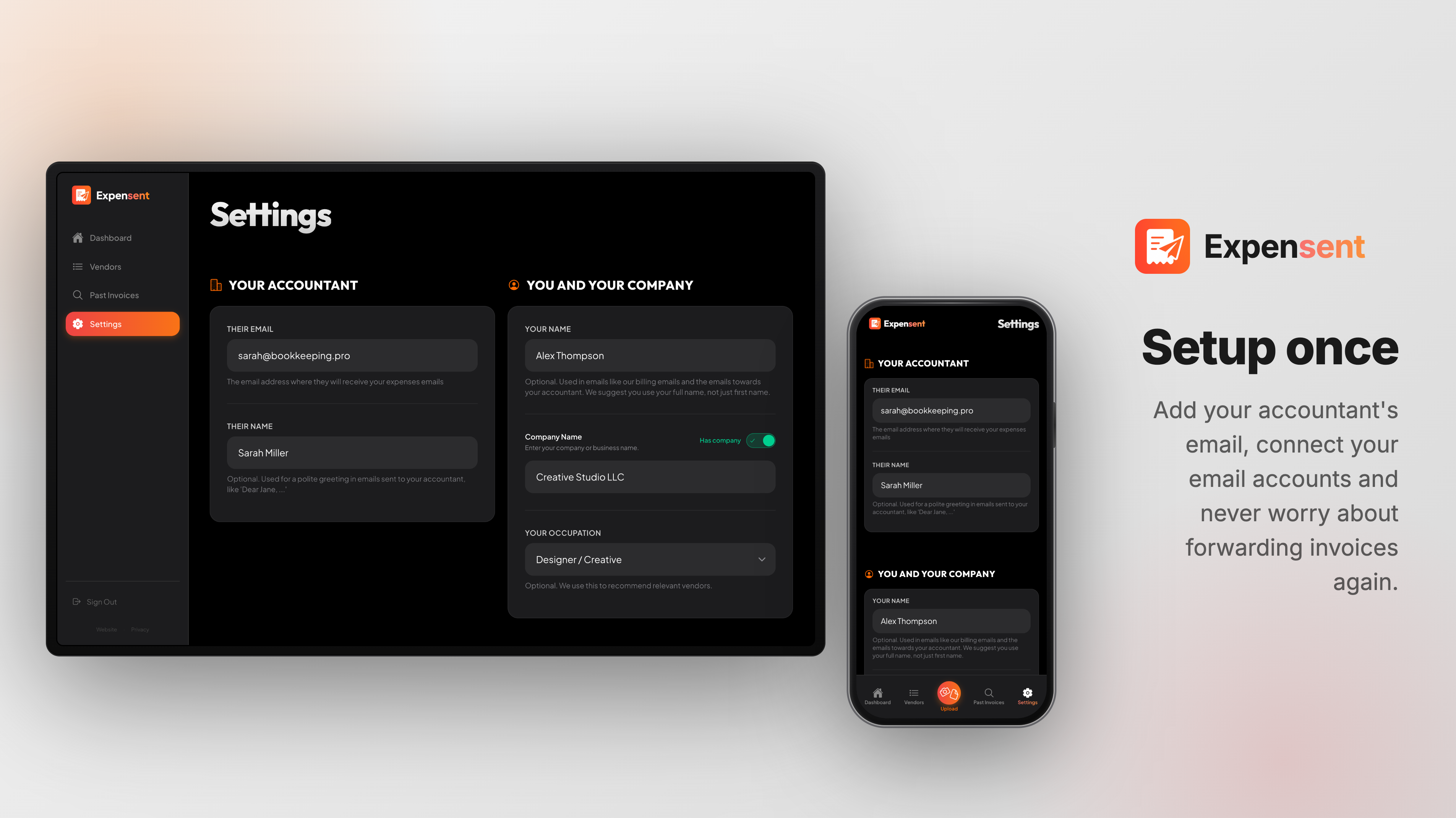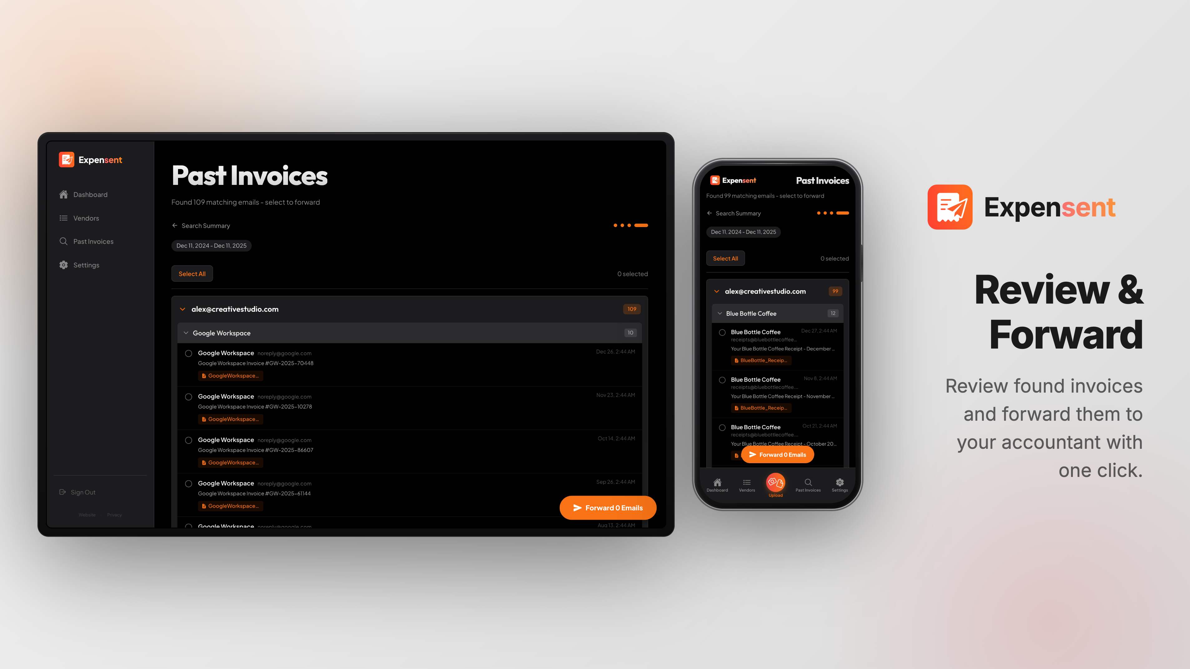 Invoices arrive in your email and get buried. Expensent automatically forwards them to your accountant — no manual forwarding again. Any sender is handled: GCP, Vercel, Figma, other SaaS tools, or your custom ones. New and past invoices are forwarded, saving time and preventing lost deductions.