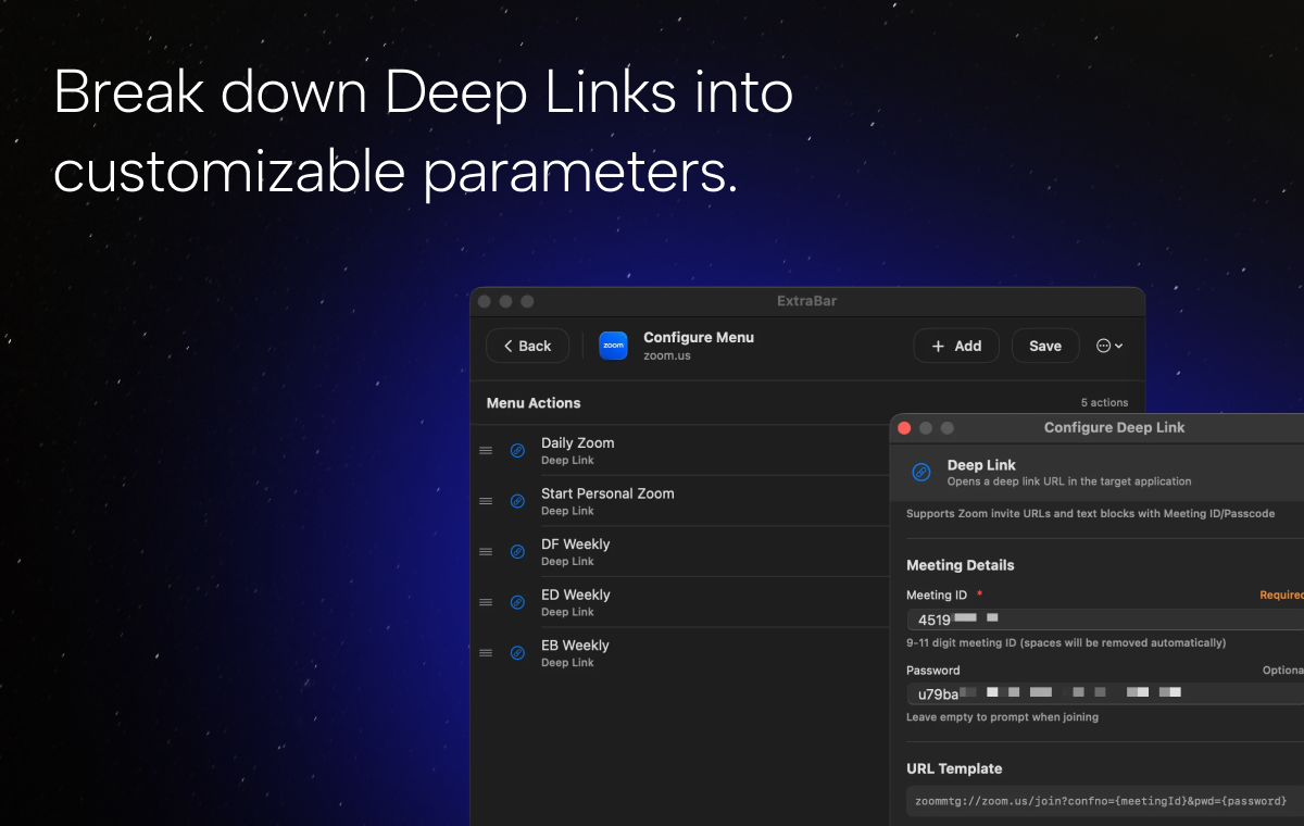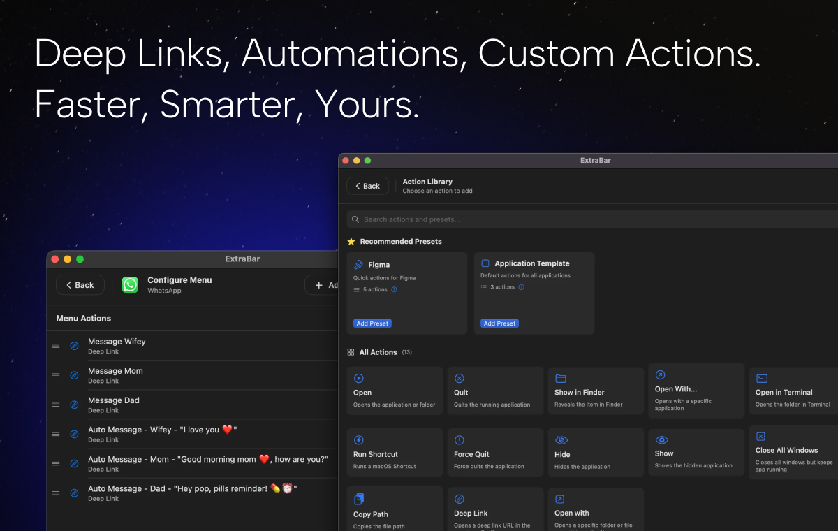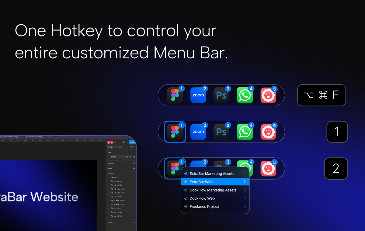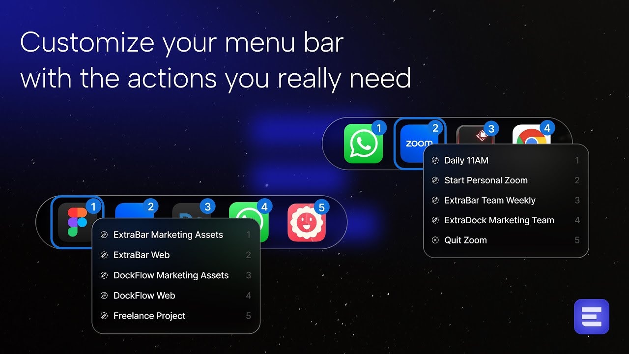 ExtraBar transforms your macOS menu bar into a customizable command center. Jump to Zoom meetings, Slack channels, VS Code projects, or Figma files instantly. Deep link into apps, run scripts, trigger automations, and access anything with keyboard shortcuts. Built for designers, developers, and anyone tired of clicking through endless menus.