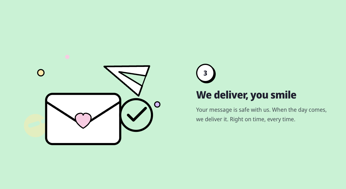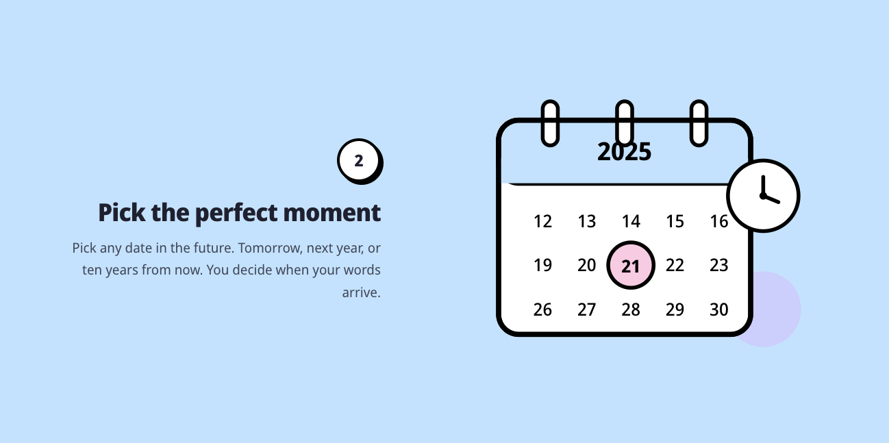 FeatureMessage lets you send a message to your future self. Write a short letter or record a video. Pick a date in the future. We’ll deliver it to your email when the time comes. No complicated setup. Just three simple steps: 1. Write a message or record a video 2. Choose when it should be delivered (months or years from now) 3. Receive it at the perfect moment People use FeatureMessage for birthdays, life goals, reminders, or quiet thoughts they don’t want to forget.