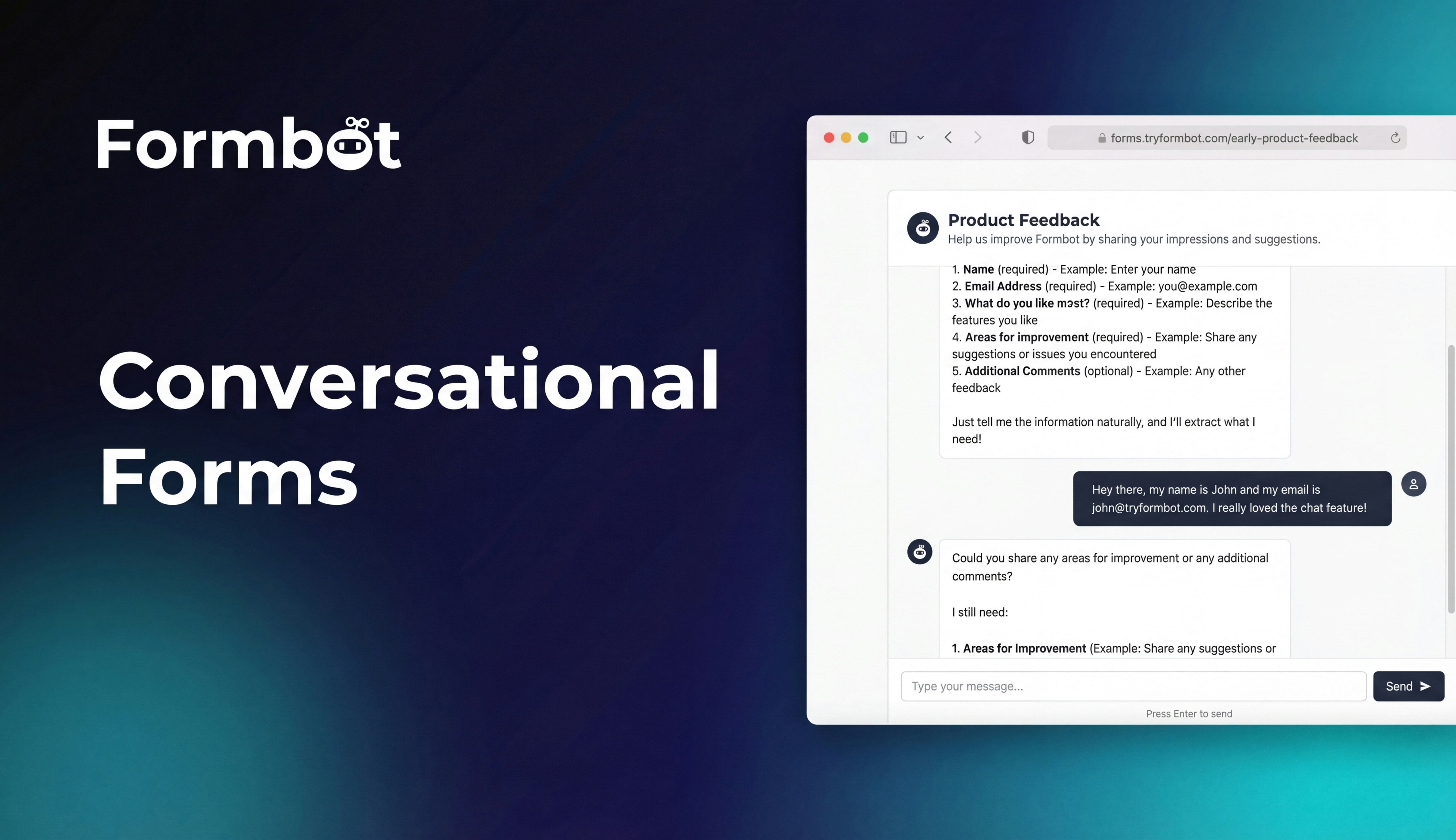 Formbot allows you to create forms with natural language and collect responses via a traditional form or use AI-native conversational chat. Our goal is to make creating and using forms simple, and super fun experience for everyone.