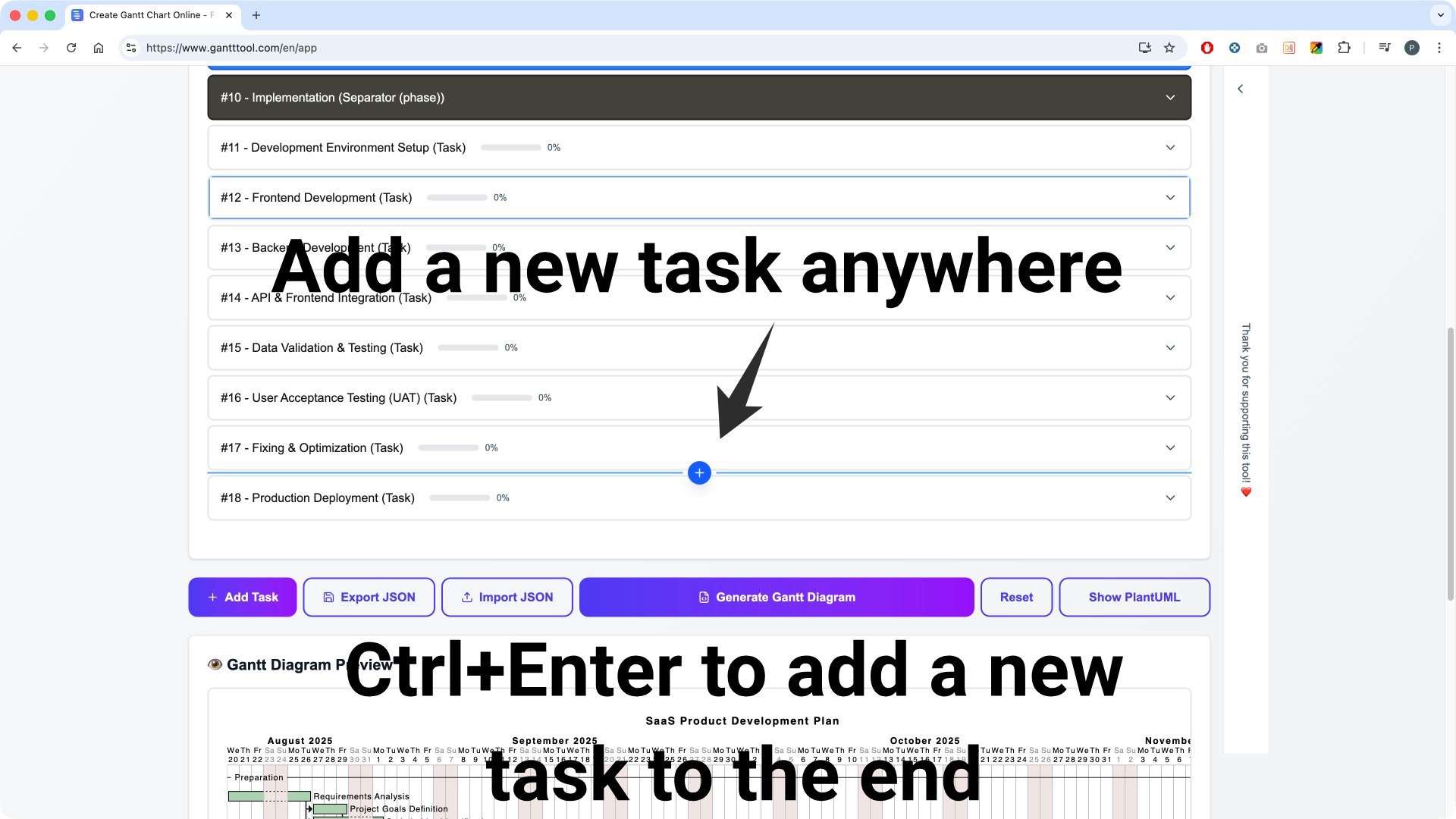 Are you looking for a simple and free tool for quickly creating professional Gantt charts? PlantUML can do it—but only if you remember all the necessary declarations and syntax, which is not always convenient. That's why I created the Gantt Chart Tool. You plan. The tool converts everything you need. No learning syntax, no delays — just a clean result.