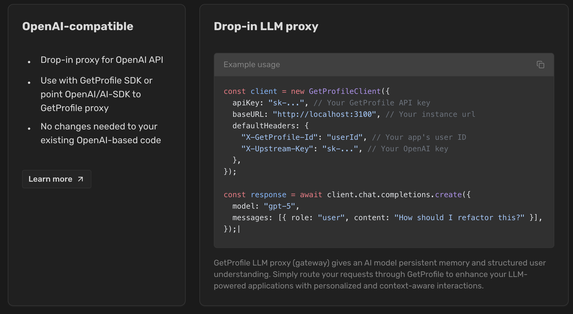Self-hosted and open-source user profiles and long-term memory for your AI agents. Unlike generic memory solutions that store blobs of text, GetProfile extracts natural language summary, typed traits with confidence scores and relevant memories with importance levels into a structured user profiles stored in your own PostgreSQL database.
