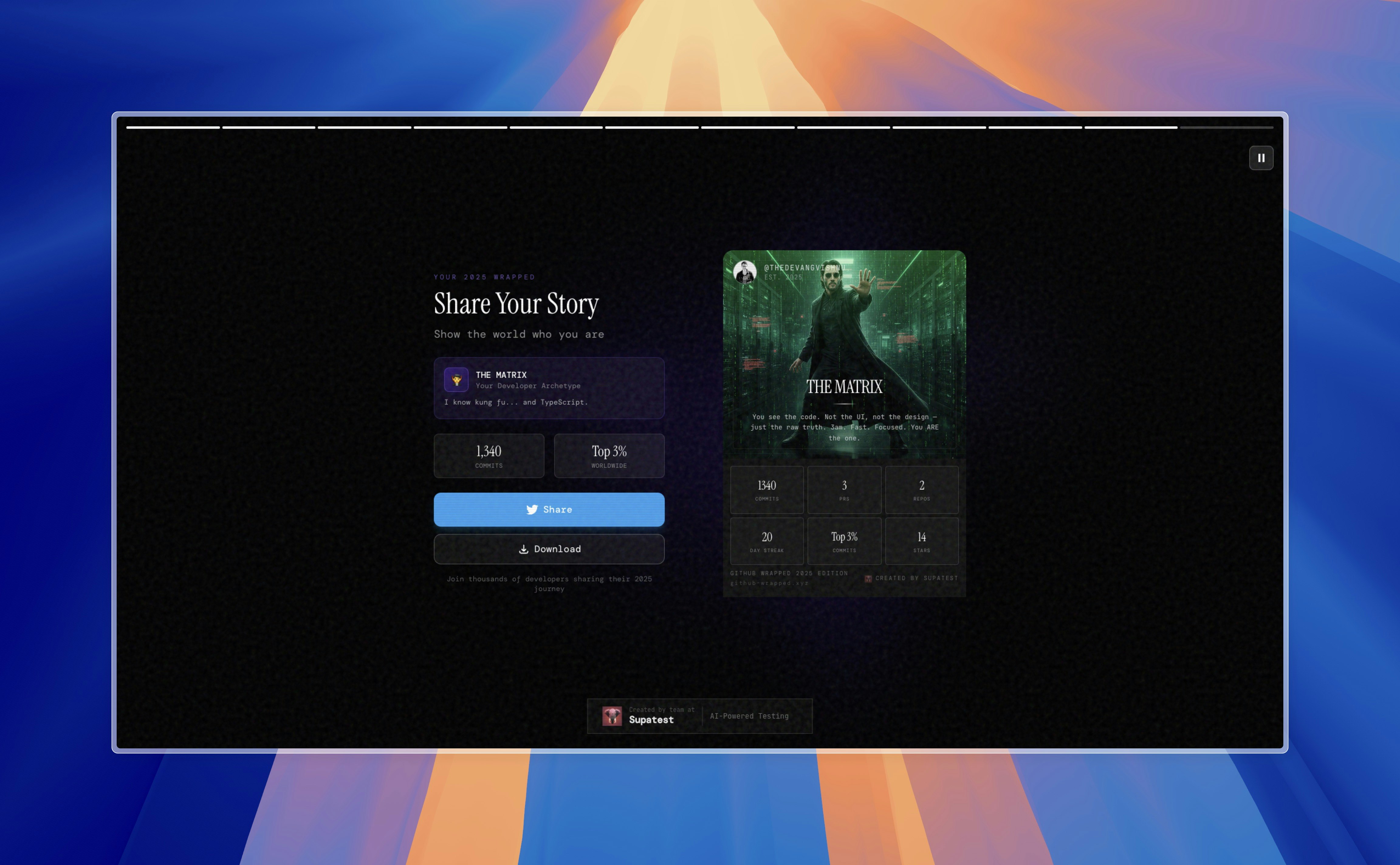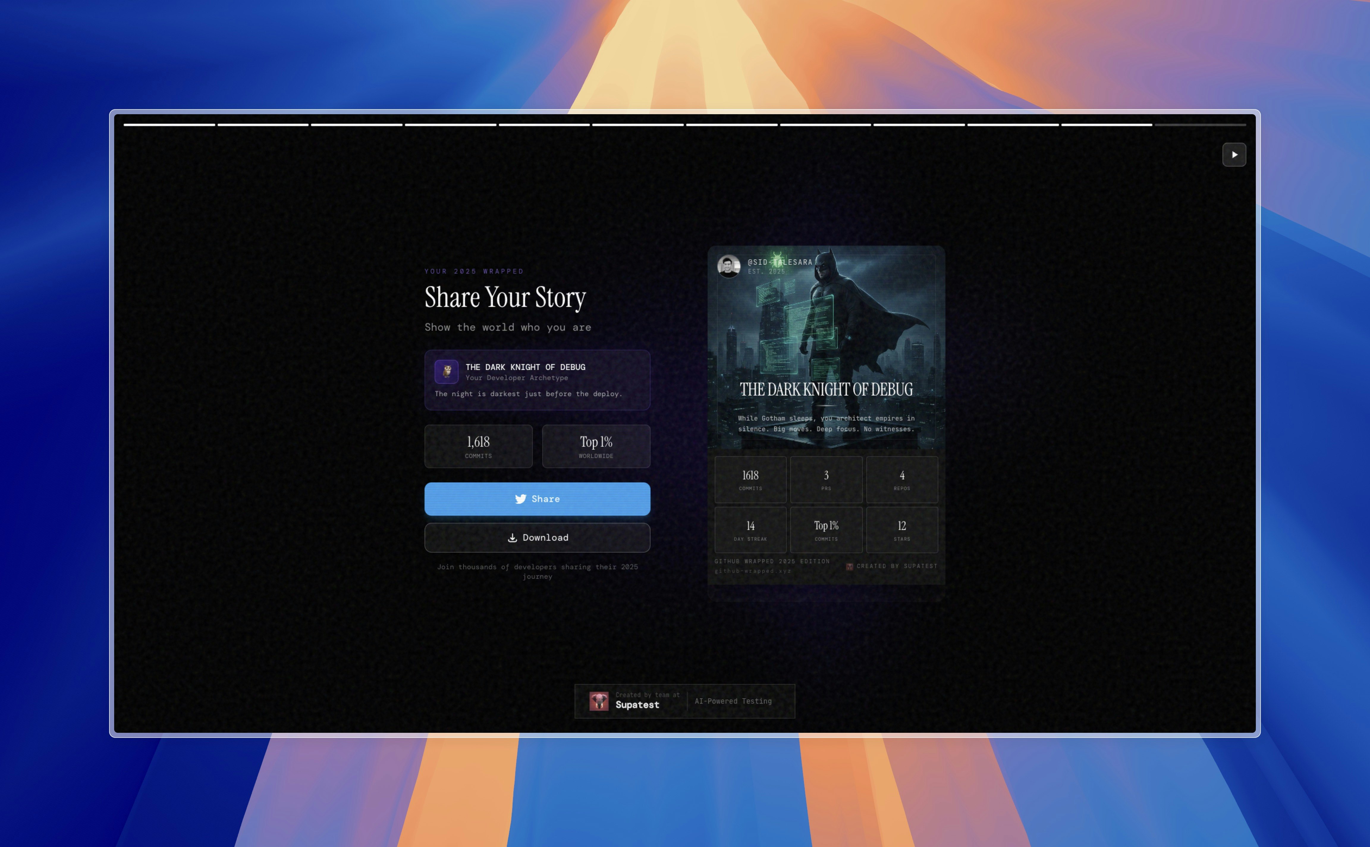 Your GitHub year as an epic story. See your 2025 in code: → Commits, PRs & lines shipped → Weekly activity heatmap → Longest streak & top languages → Global ranking (Top 1%? Top 3%?) Then discover your Developer Personality: The Matrix • The Dark Knight • The Pushpa • The Godfather • John Wick • Interstellar • Top Gun • Oppenheimer • RRR • Mission Impossible • Dangal • The Joker • Avenger • ZNMD • Inception • Dilwale Which one are you? Free. 10 seconds. Instantly shareable.