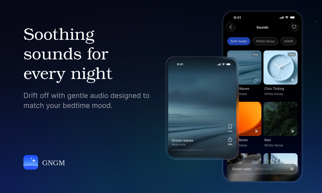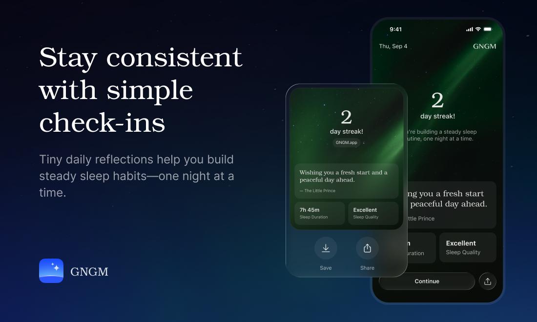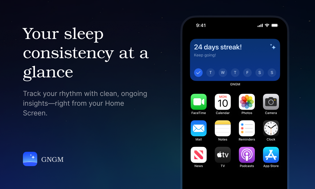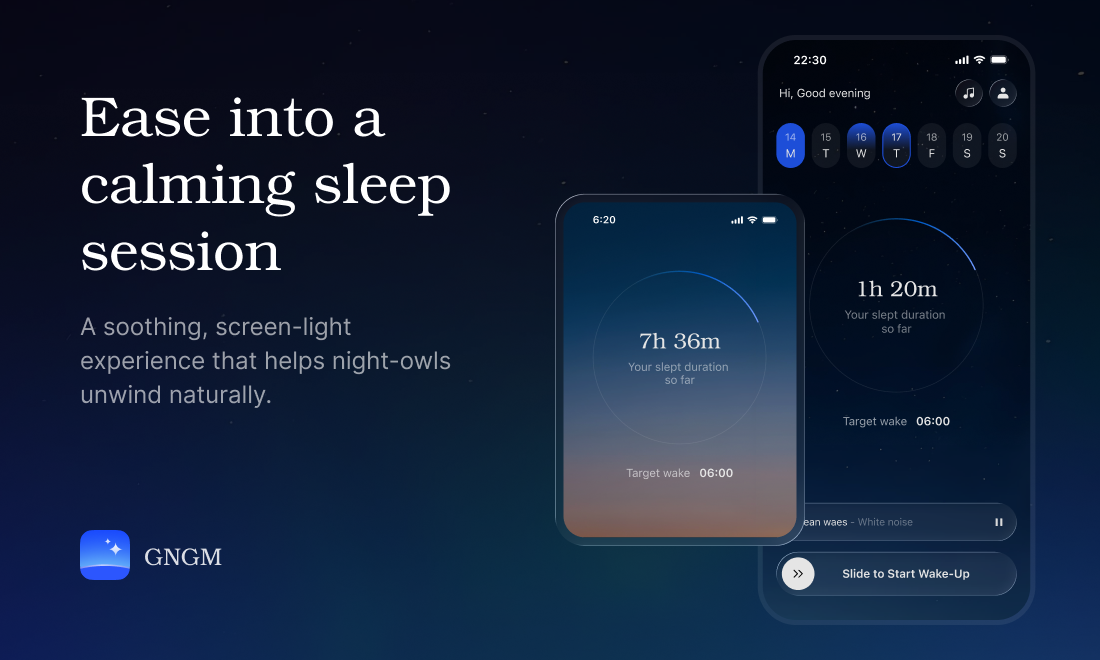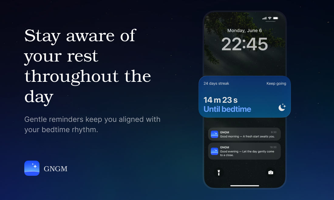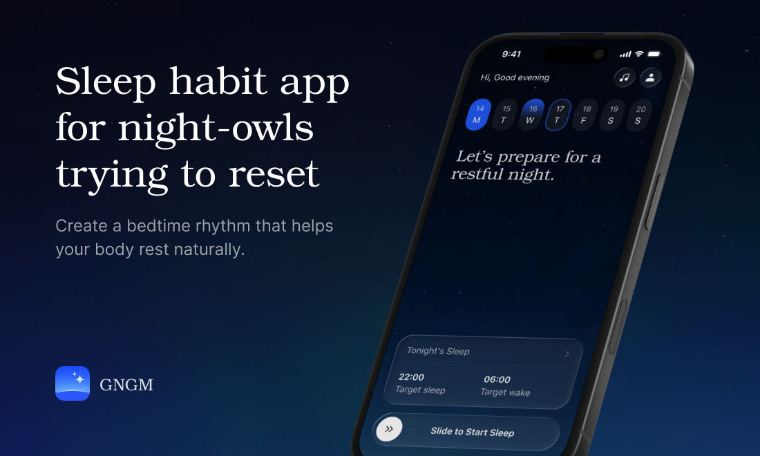 GNGM helps night-owls rebuild a gentle, consistent sleep rhythm with one simple nightly check-in. No trackers, no pressure, no data overload — just a calming routine that helps your body reset naturally.