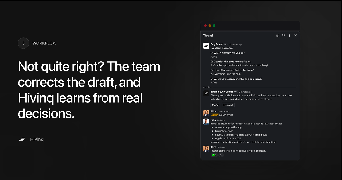 A lot of teams are hesitant to adopt AI customer service bots due to their inauthenticity in replies, hallucination, etc. As a result, they're not able to leverage the speed of LLM's to reduce their customer turnaround time. So instead of replying to the customer directly, Hivinq drafts responses for the customer support team using it's knowledge about the product. If the drafted answers are inaccurate, team members can let it know and it will observe the thread to learn and correct itself.