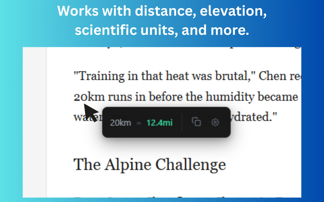 Chrome Extension that convert units instantly by simply hovering over them. Temperature, metrics, imperial, and more. Fast, clean, effortless. Stop copying values into conversion calculators. HoverConvert automatically detects units on any webpage and shows conversions in a clean tooltip the moment you hover over them.