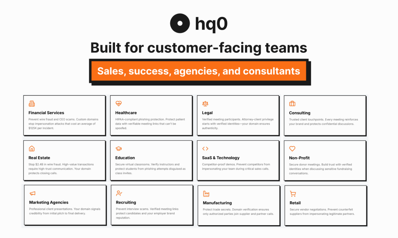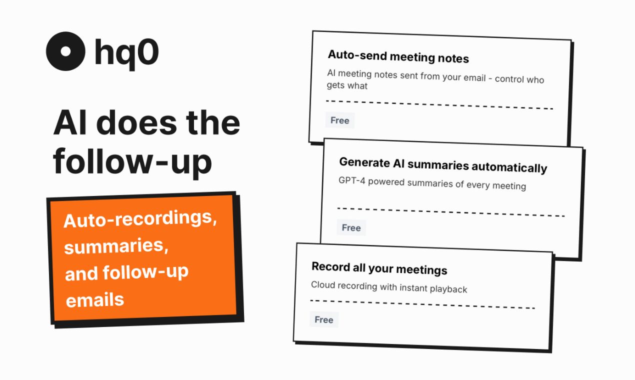 Why send customers to zoom.us when they could meet at meetings.yourcompany.com? hq0 lets you run fully branded video meetings from your own domain — with your logo, your colors, and zero third-party branding. Plus, every meeting is automatically recorded, summarized by AI, and followed up with an email. Built for customer-facing teams who know first impressions matter.
