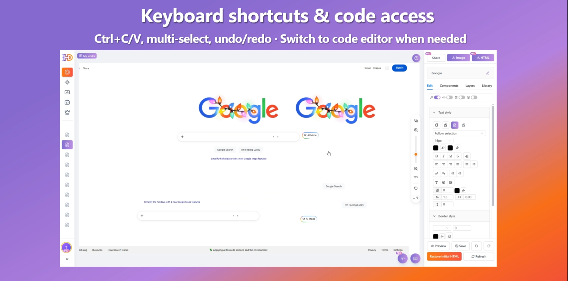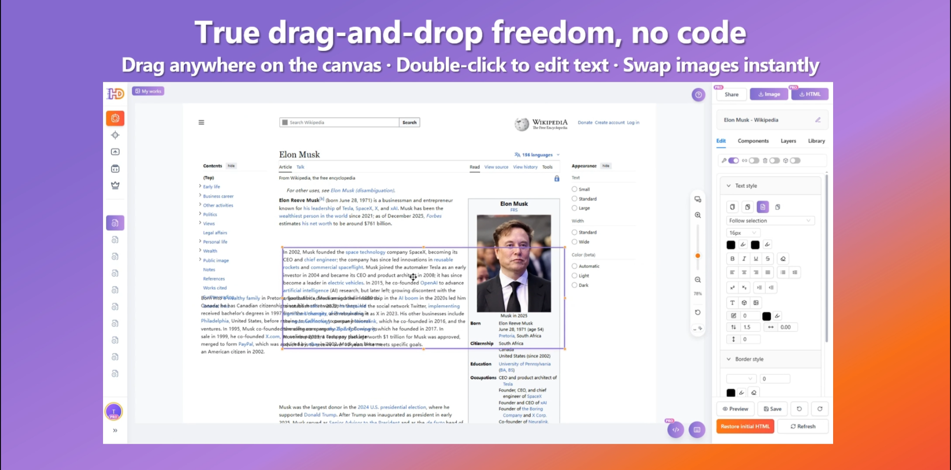 A freeform canvas to edit any HTML without grid constraints. Import a URL, upload any HTML file, or paste code — then drag elements anywhere and double‑click to edit text. No rigid structures, just pure creative freedom for all your web content. Share your work via a public link or download your edits instantly.