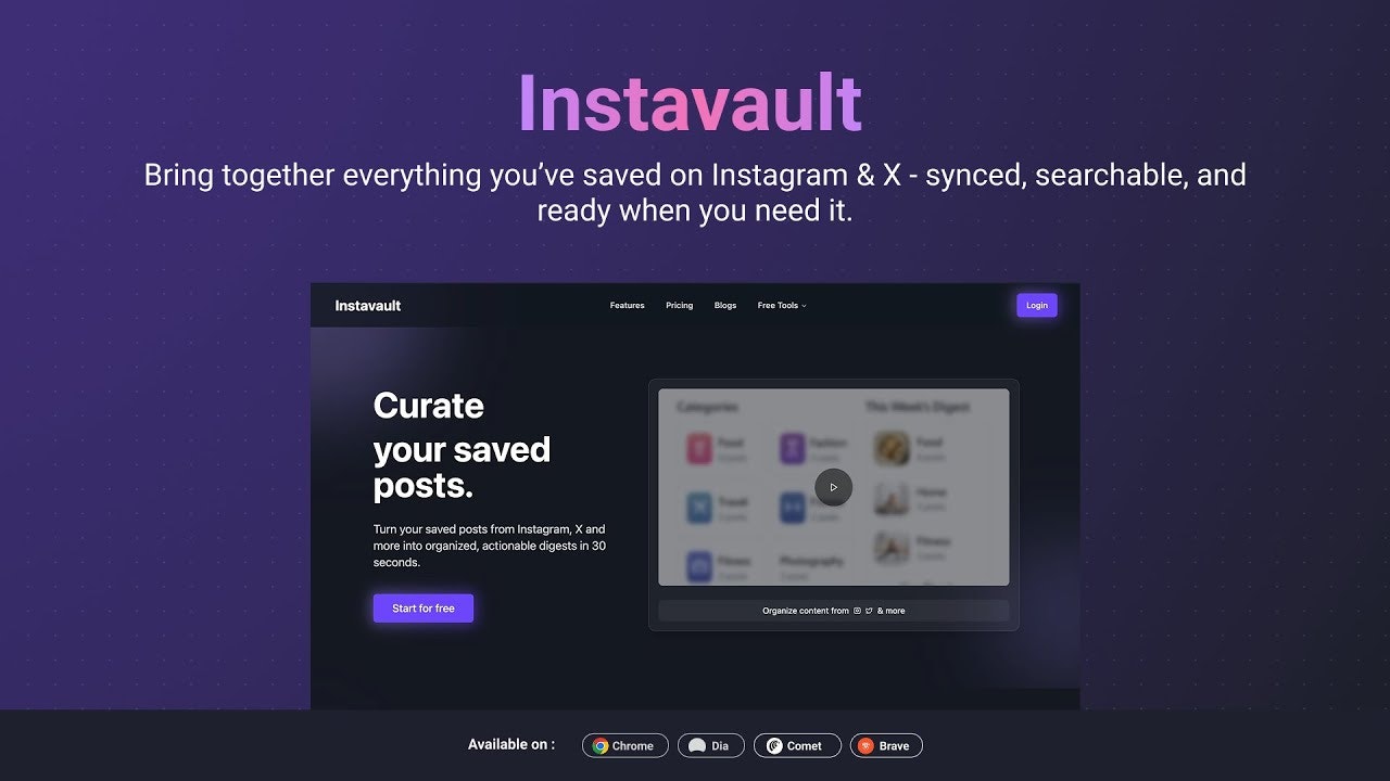 Instavault turns your saved Instagram, TikTok, LinkedIn, and X posts into one organised, visual, searchable system. π Rewind 2025 for your saves - personality type, patterns & comparisons πΈοΈ Visualise Me - a knowledge graph of what you actually consume β¨ AI auto-categorisation, cross-platform search, exports to Notion/Sheets, and timeline insights Built for creators, researchers & digital hoarders. Free to try π