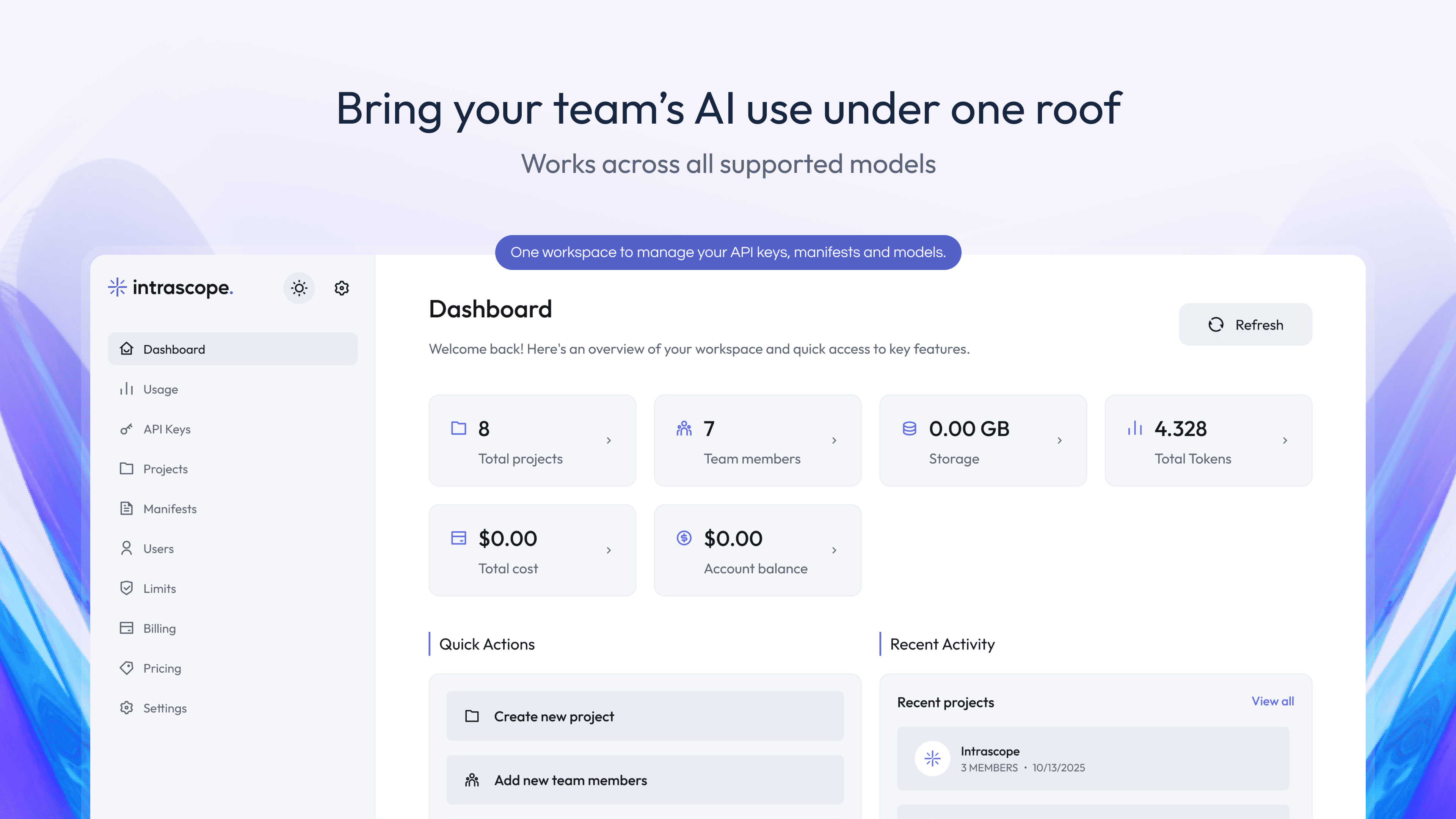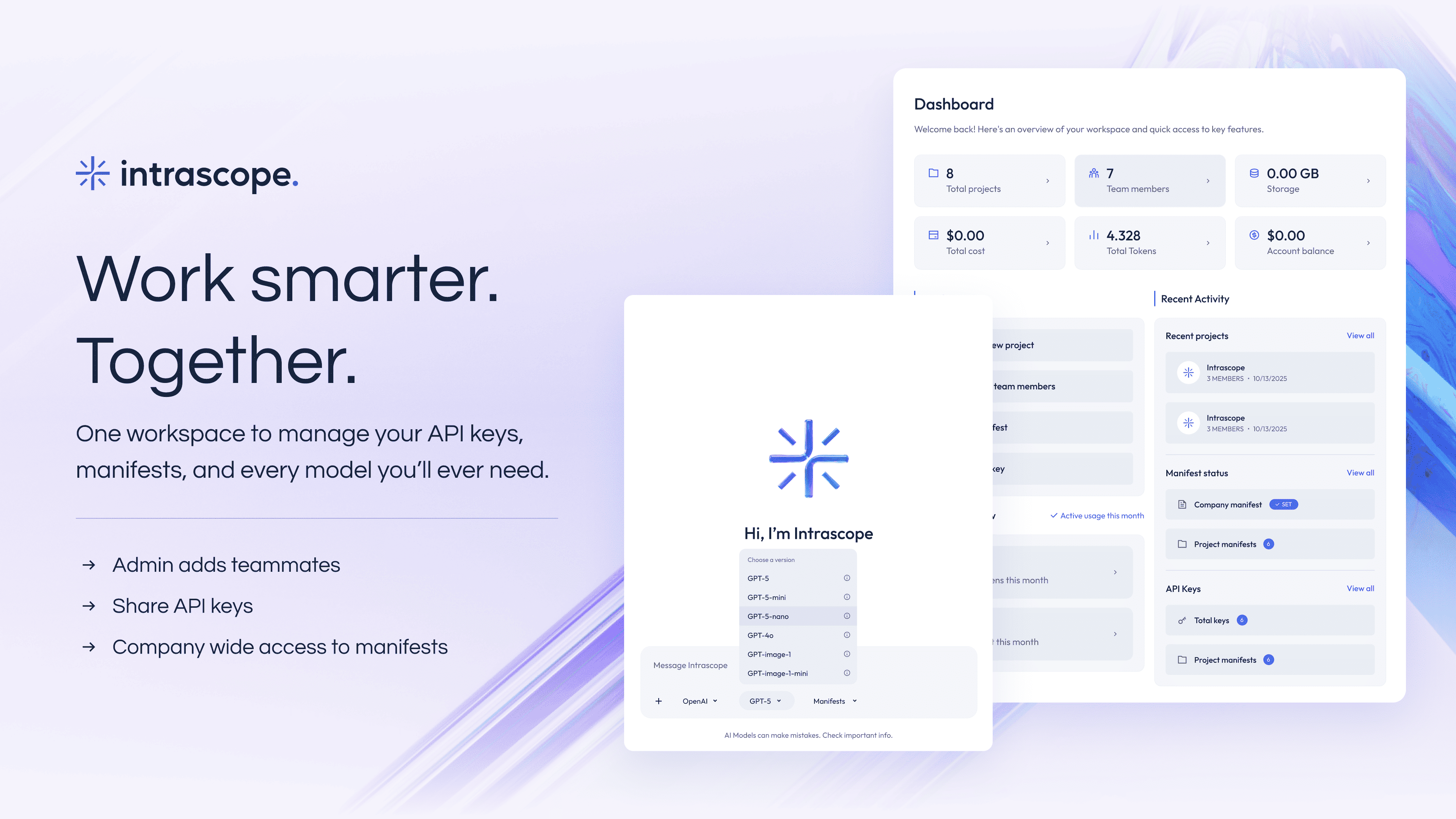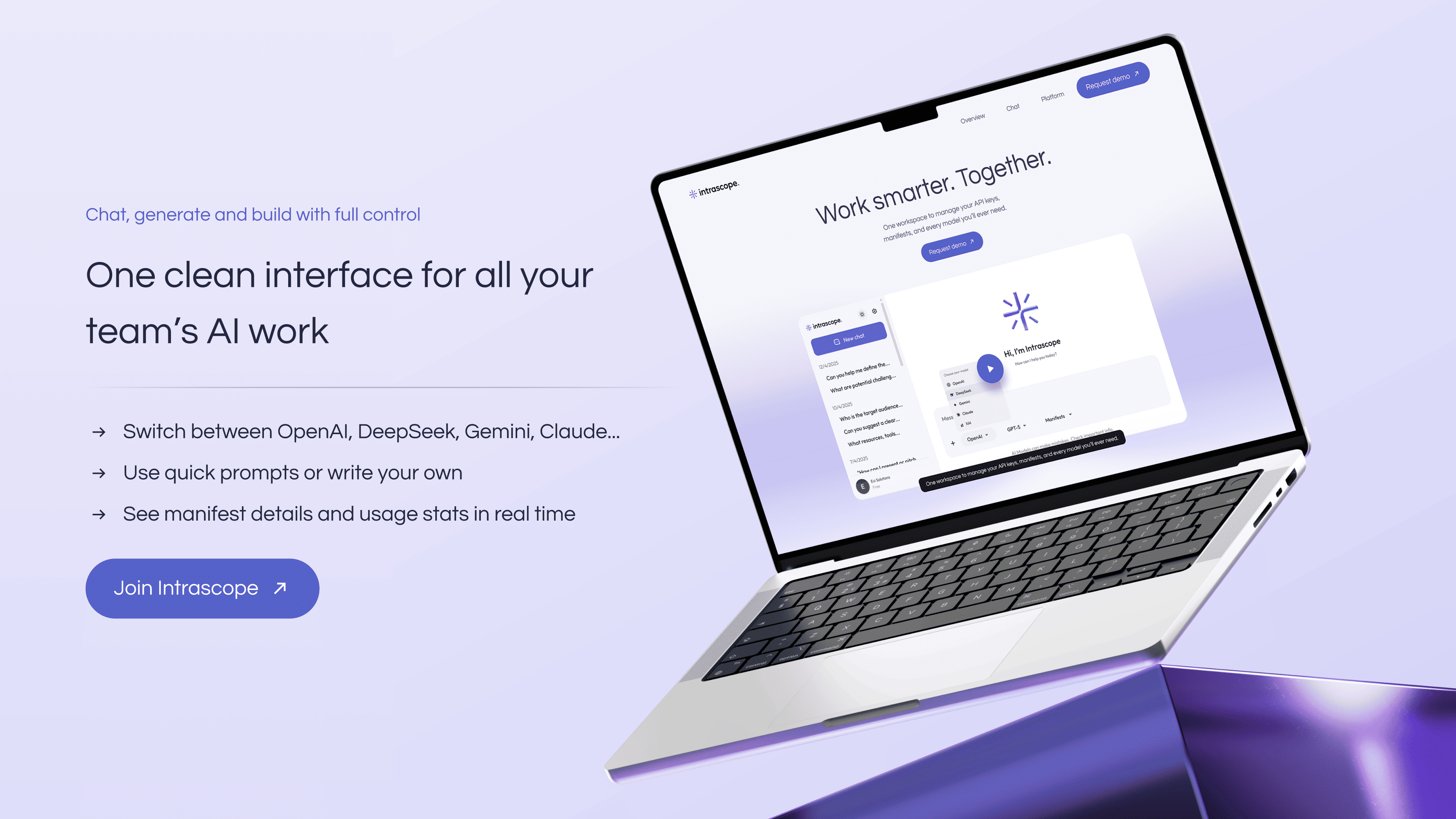 Intrascope is a shared AI workspace that helps teams stay organized, reduce costs, and keep all AI usage in one place. Admins set providers, limits, and rules, while the team works in a simple chat with shared context and reusable Manifests. No more scattered chats or separate API keys. AI becomes structured, predictable, and safe for the whole team.