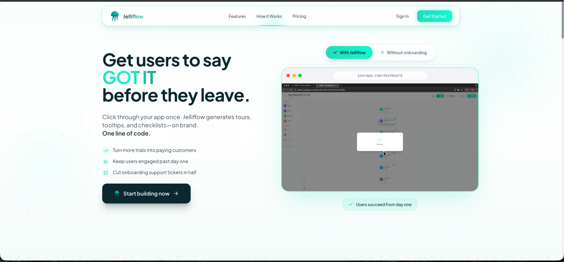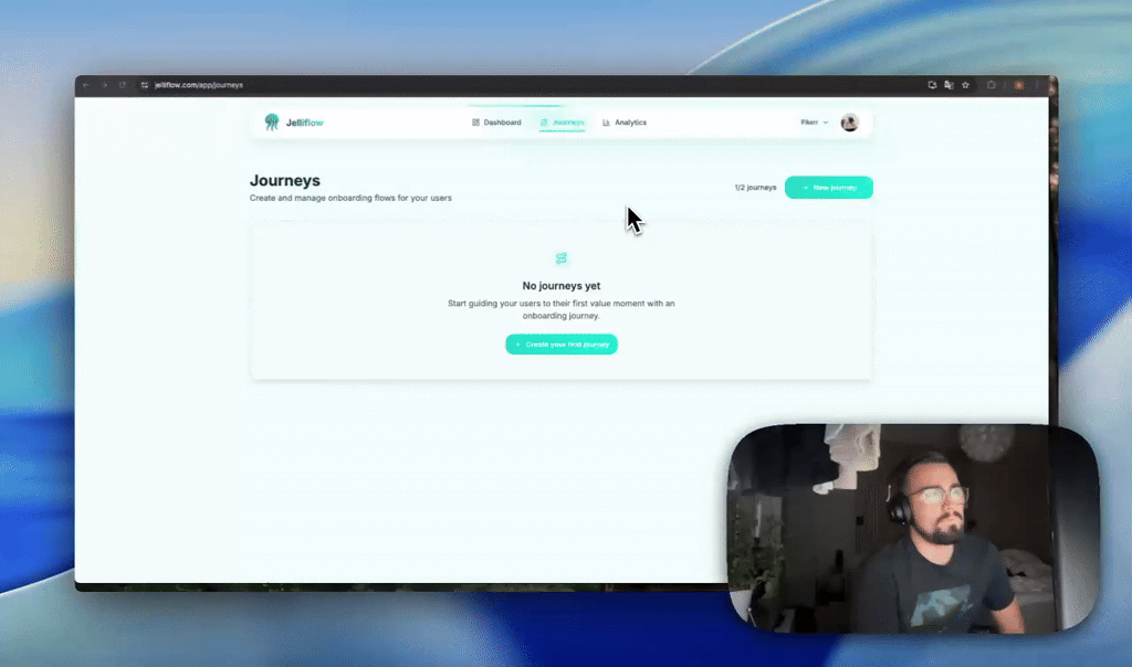 Stop spending days manually building product tours. Jelliflow uses AI to turn a simple screen recording into complete onboarding flows—interactive tours, tooltips, and checklists—in under 10 minutes. Just record yourself using your product. Our AI watches, learns the flow, and generates everything automatically. Embed it with a single code snippet. Built by a founder who lost 6 products to bad onboarding. Now you don't have to.
