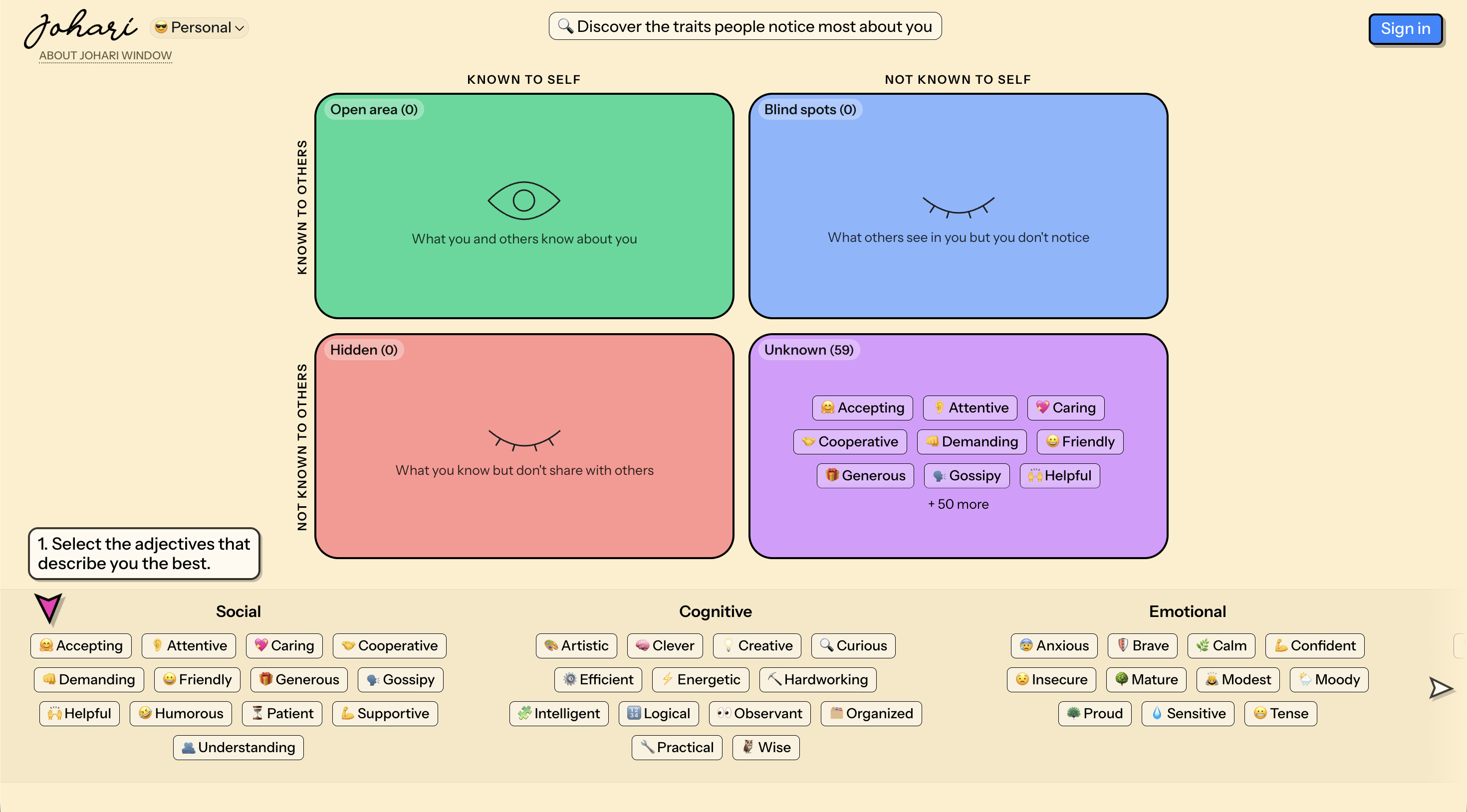 What do people notice about you that you don't see yourself? Johari Window is a self-awareness tool that maps your personality from two angles: how you see yourself vs. how others see you. Compare the results to uncover blind spots, hidden strengths, and the traits that define how you show up. Quick to use. Surprisingly revealing.