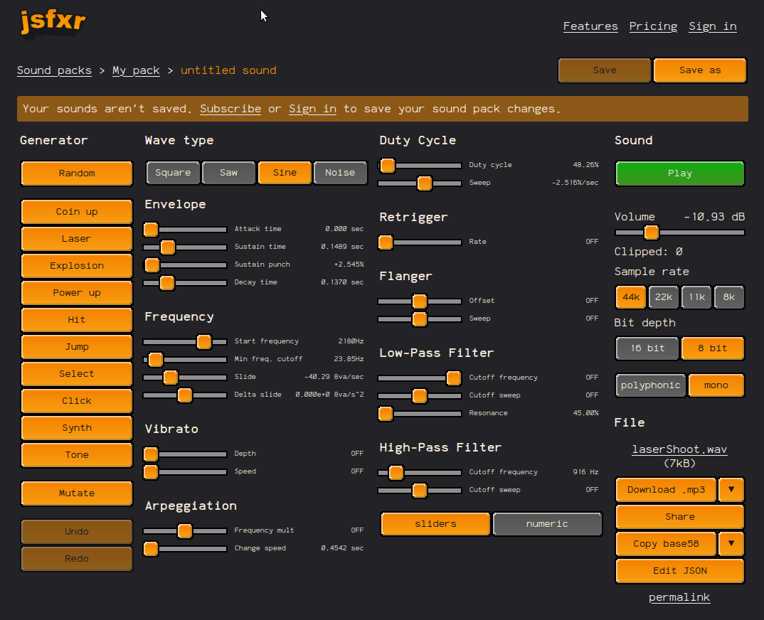 Retro 8-bit sound effects generator for devs & musicians, built the popular open-source jsfxr (10k+ monthly visitors). **Key features:** - **Sound Packs** - Organize by project, download ZIP - **Cloud Sync** - Access from any device - **Multiple Formats** - WAV, MP3, OGG, SFXR - **Unlimited Undo/Redo** - **JSON Editor** - Precise control, copy/paste - **Privacy-First** - No ads / trackers - **Dark Mode** pixel art UI Perfect for jams and indie devs using Unity, Godot, GameMaker, or Unreal.