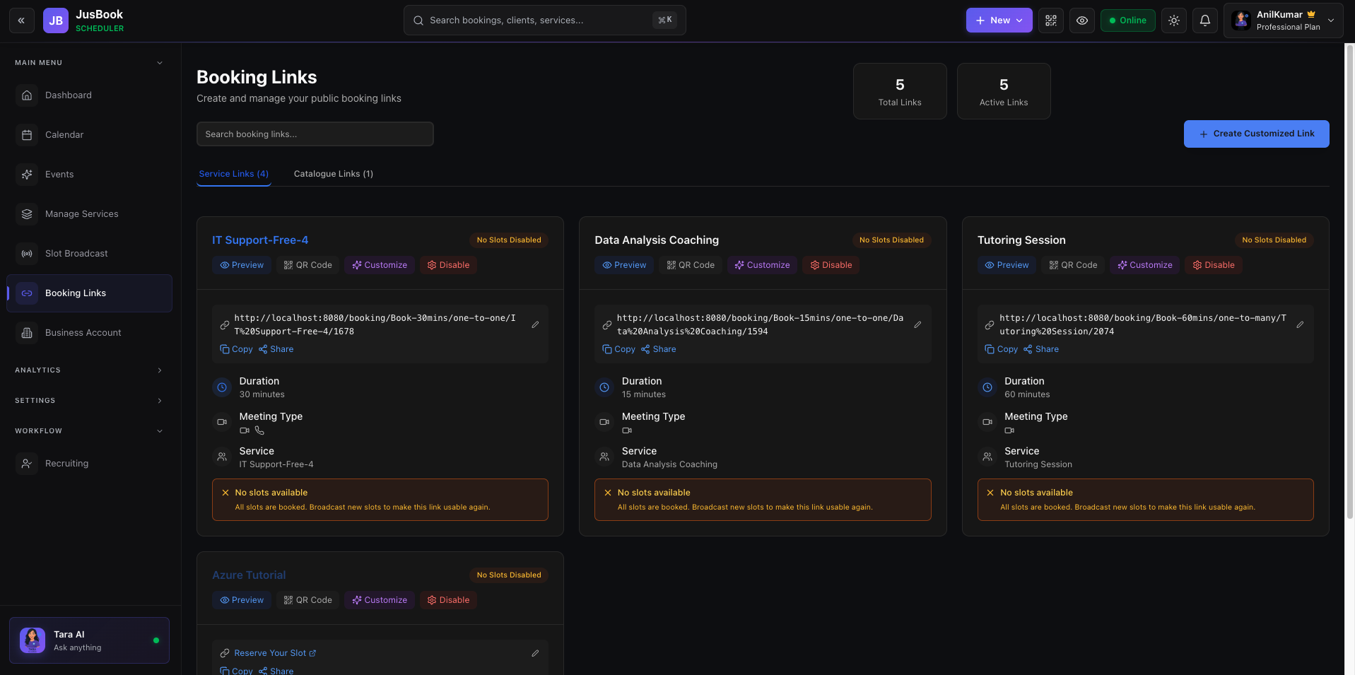 Most scheduling tools stop at booking meetings. JusBook is built as a Scheduling OS. Whatβs new in this launch: π€ Tara AI β an intelligent assistant to manage scheduling workflows π Catalogs β organize and publish multiple services from a single link π₯ 1-Many Bookings β host group sessions, workshops, and events π Google & Microsoft Calendar Sync β real-time availability, zero conflicts π’ Professional & Enterprise plans β built for teams, roles, and scale