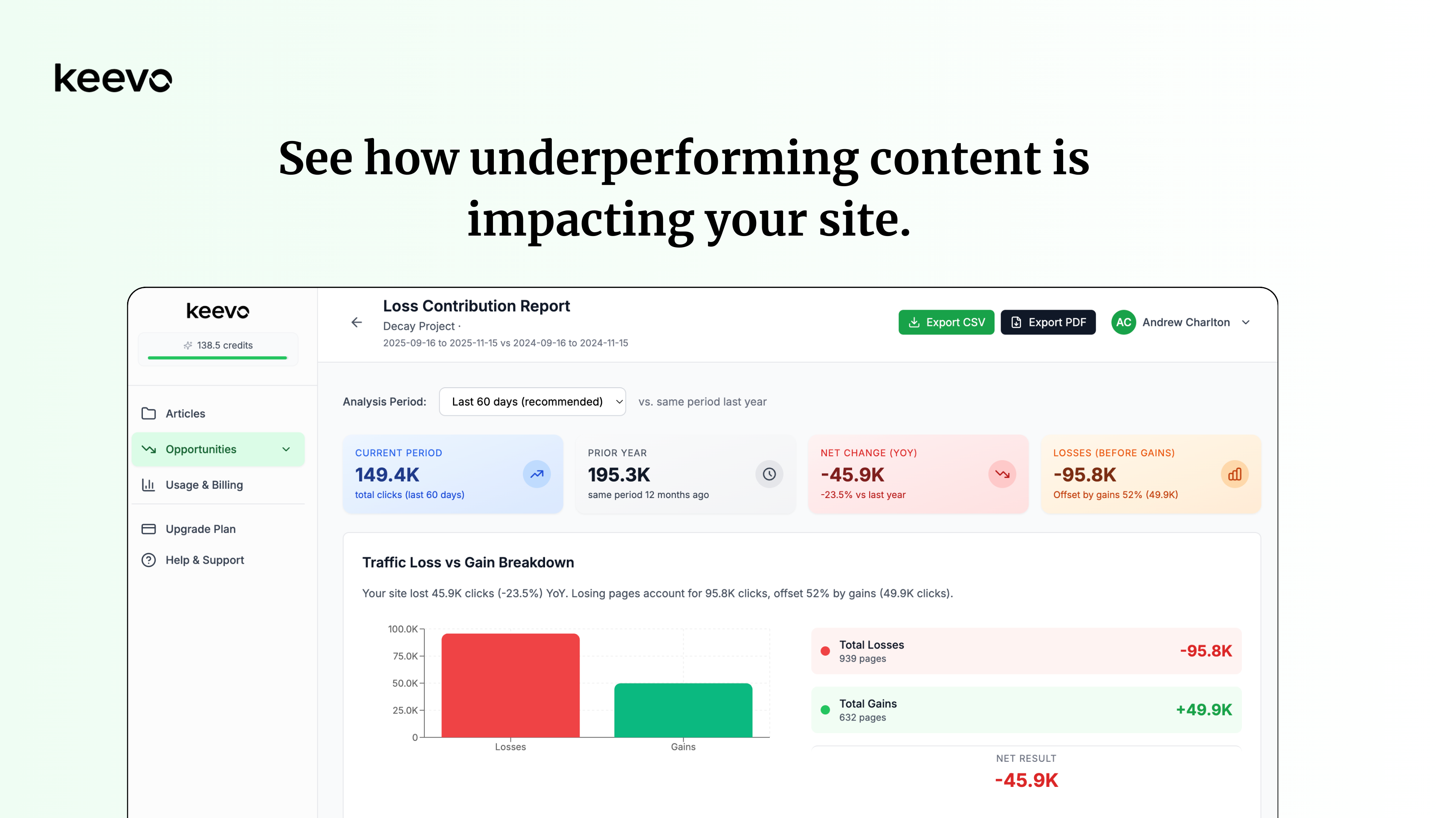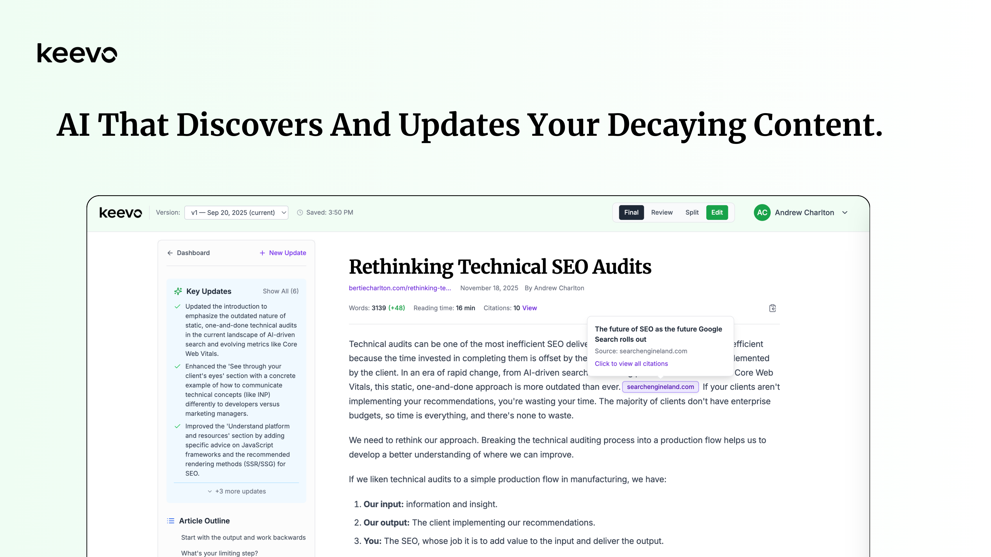Keevo stops content decay before it kills your search traffic. It tracks Google Search Console for early drops, rewrites decaying pages in your brand voice, and backs them up with sources - so rankings recover before they slip.