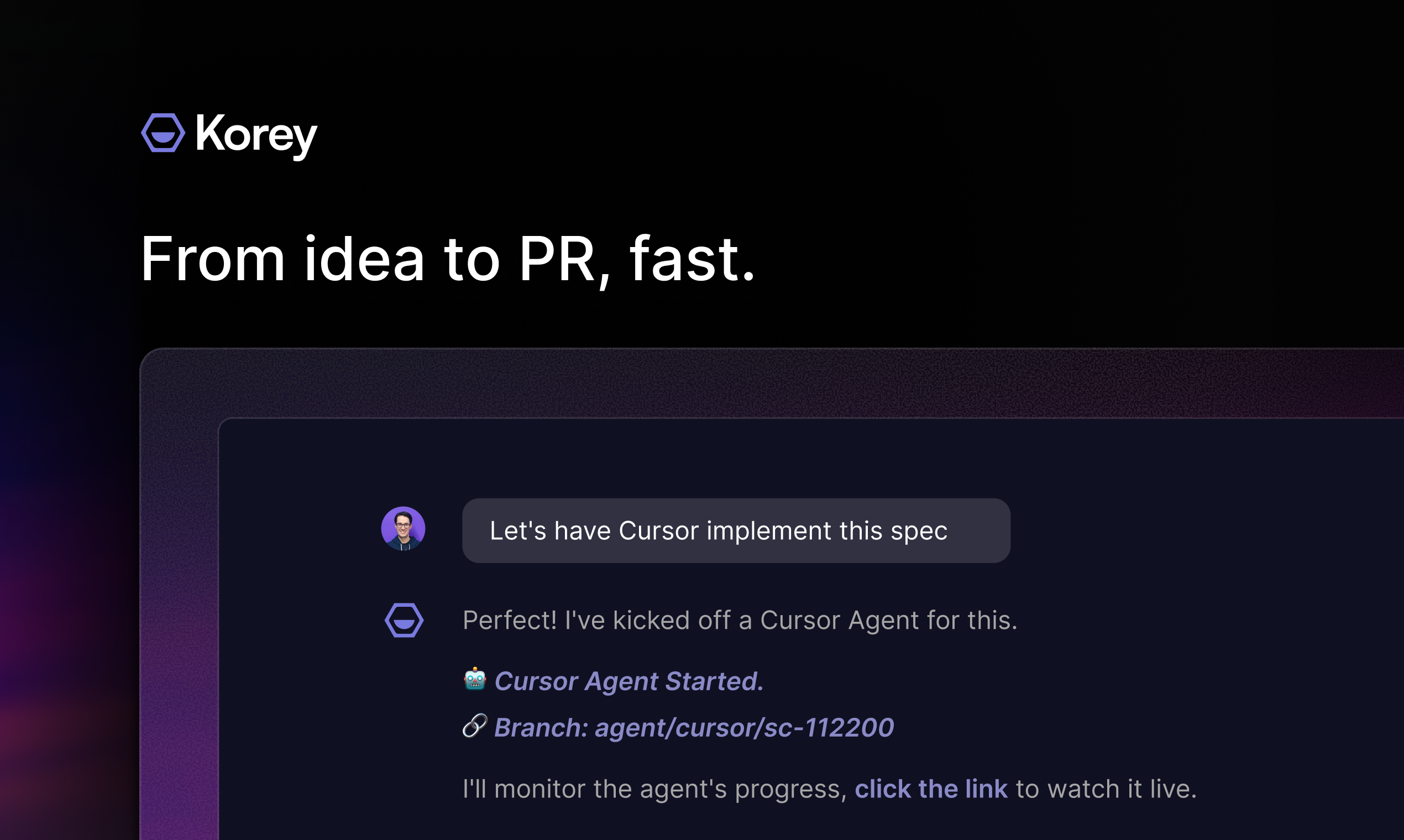 Korey is an AI agent that accelerates product engineering workflows by automating the steps between idea and implementation. The new Coding Agent Handoff workflow turns ideas into specs, generates tasks, and hands them directly to coding agents like Cursor, Devin, and Jules to produce PRs. Connected to tools like GitHub Issues and Shortcut, Korey keeps work moving automatically so engineers spend less time organizing and more time shipping.