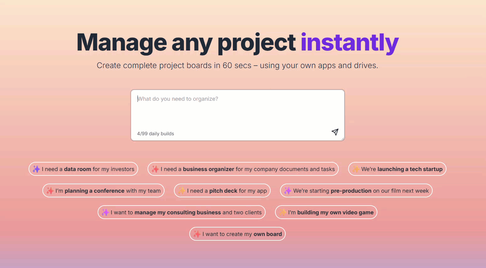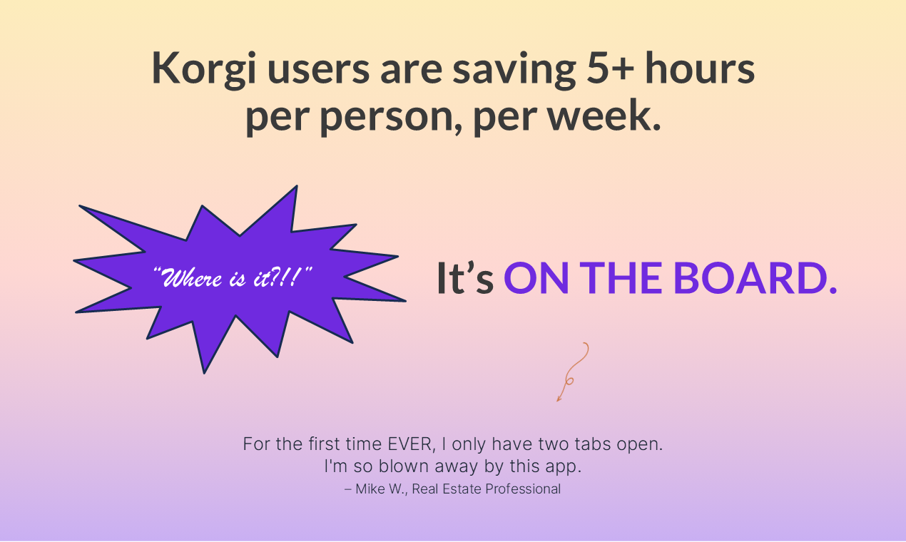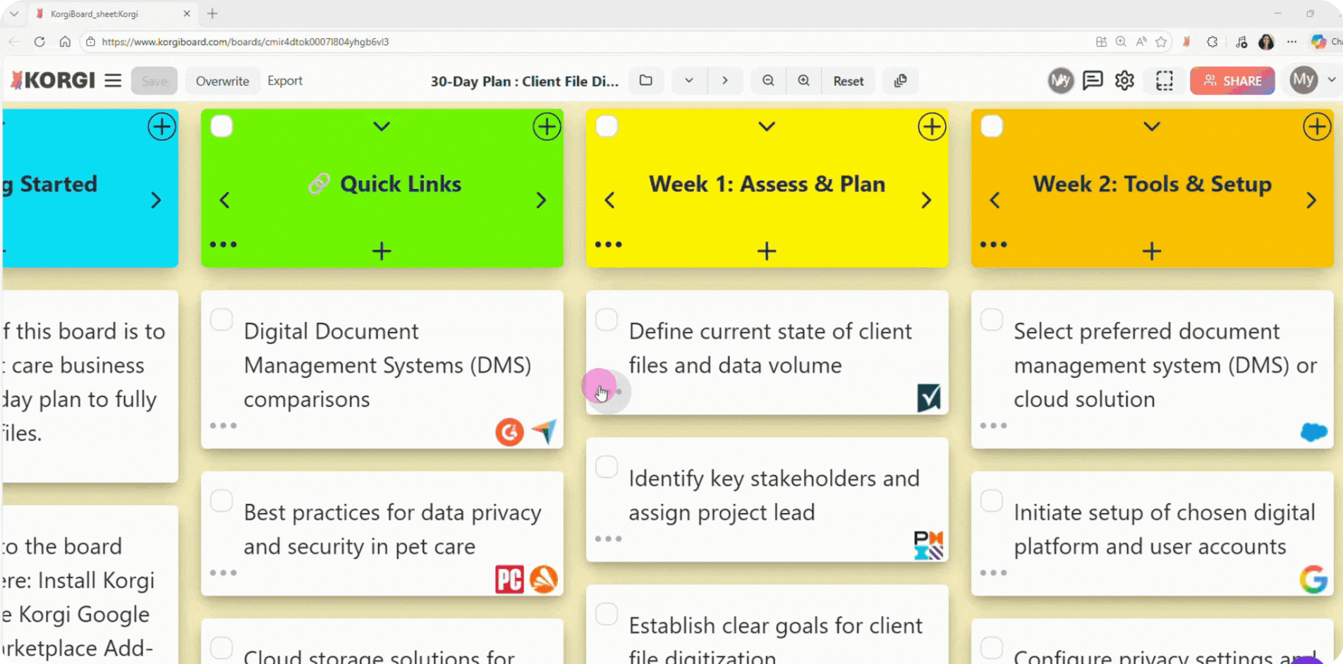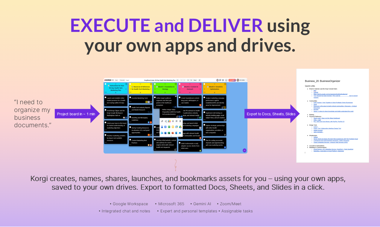 Korgi connects your scattered productivity stack in a single project management app. AI generates your project board with content, steps, and links in less than a minute. You take action while Korgi creates, shares, and launches assets in a click, using your own apps and drives (Google, Microsoft, Zoom, and more) – with integrated chat and AI. Deliver finished boards as formatted files instantly. No more planning paralysis and hunting through files and tabs. Where is it? It's ON THE BOARD.