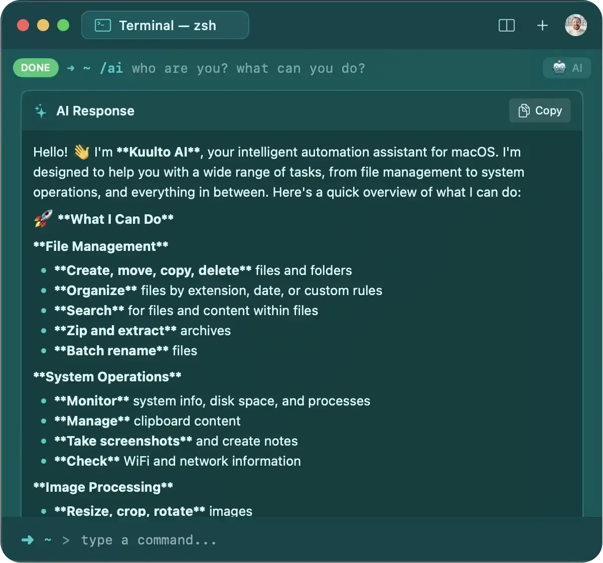 A modern terminal that bridges classic CLI power with an intuitive interface. Use /ai to organize files, convert image formats, translate documents, and more. Built-in Git integration and enhanced commands like ls and grep for a smoother experience.