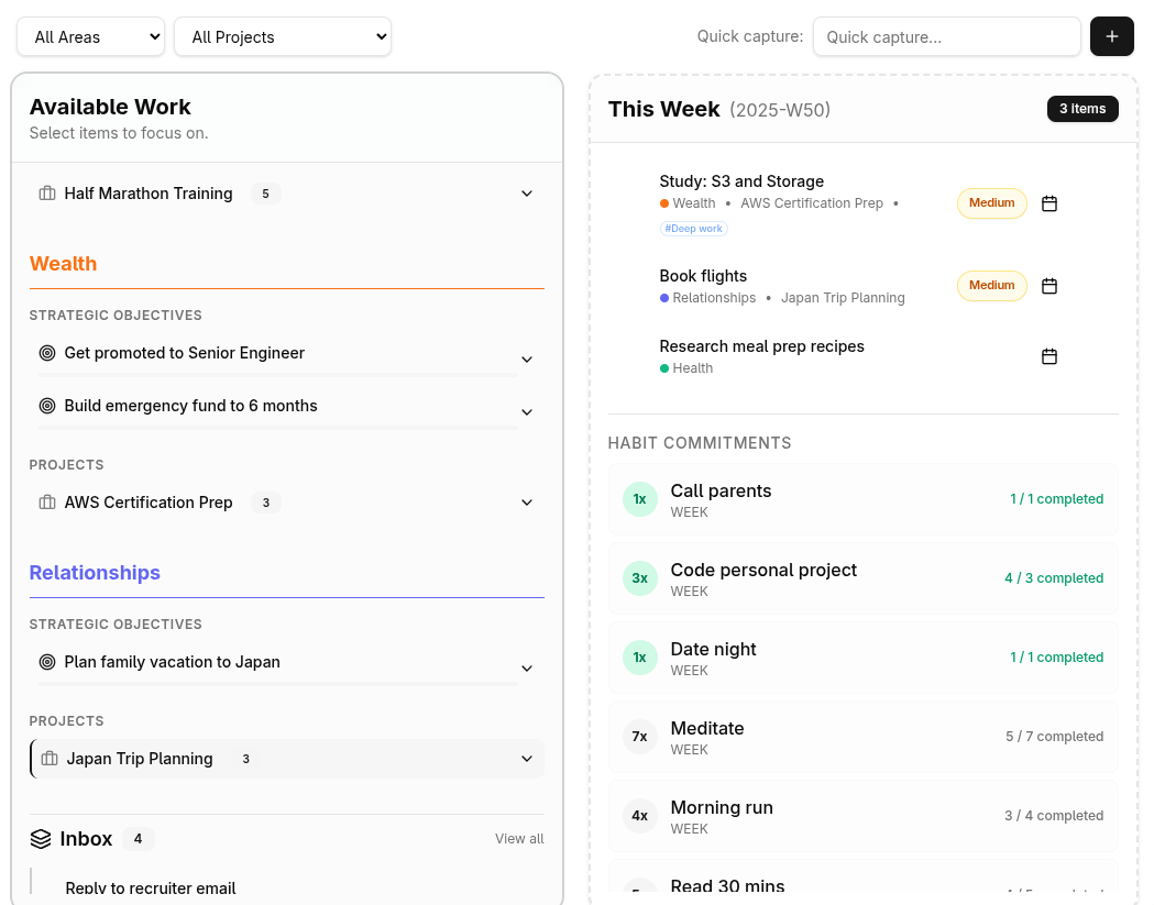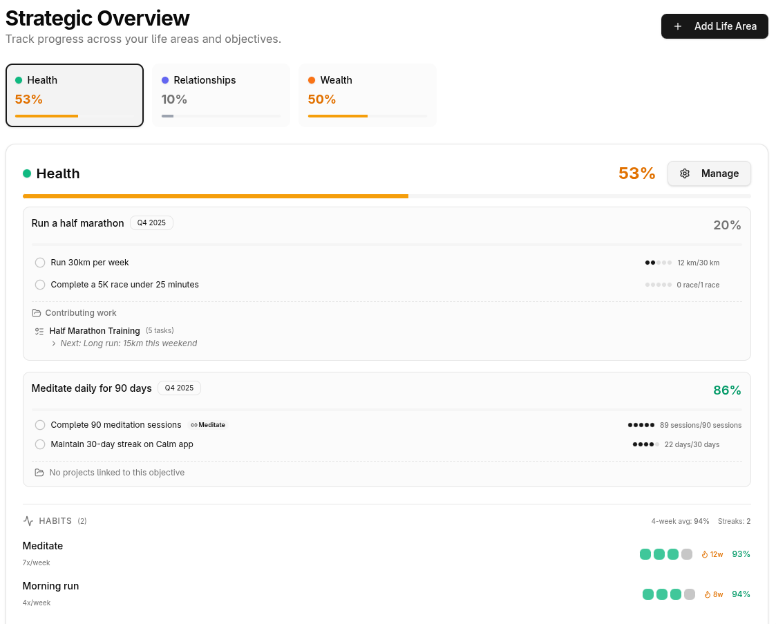 LifeGrid connects your daily tasks to your life goals through three layers: Strategy (Life Areas + OKRs) Tactics (Projects + Habits) Action (Daily Focus). LifeGrid is an operating system for your life. Ensuring every task you complete moves you toward your goals.