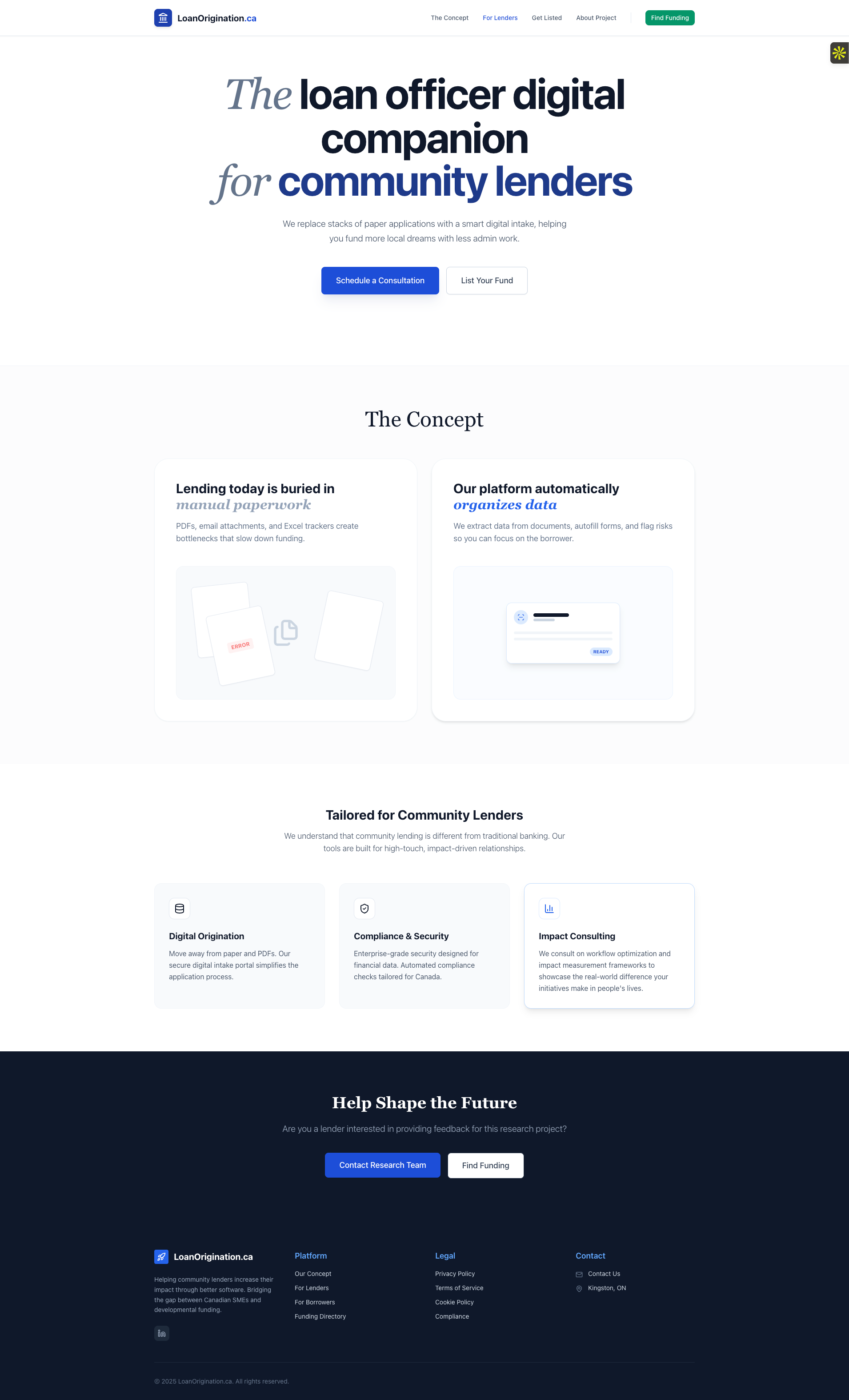 LoanOrigination.ca is a modern commercial loan origination platform built for Canadian community lenders, credit unions, and banks. It combines a digital intake and workflow engine with a growing directory that connects Canadian SMEs and projects to the right lenders and funding programs. The platform replaces paper applications with smart digital intake, automates data extraction and workflows, and helps lenders fund more local dreams with less admin work.