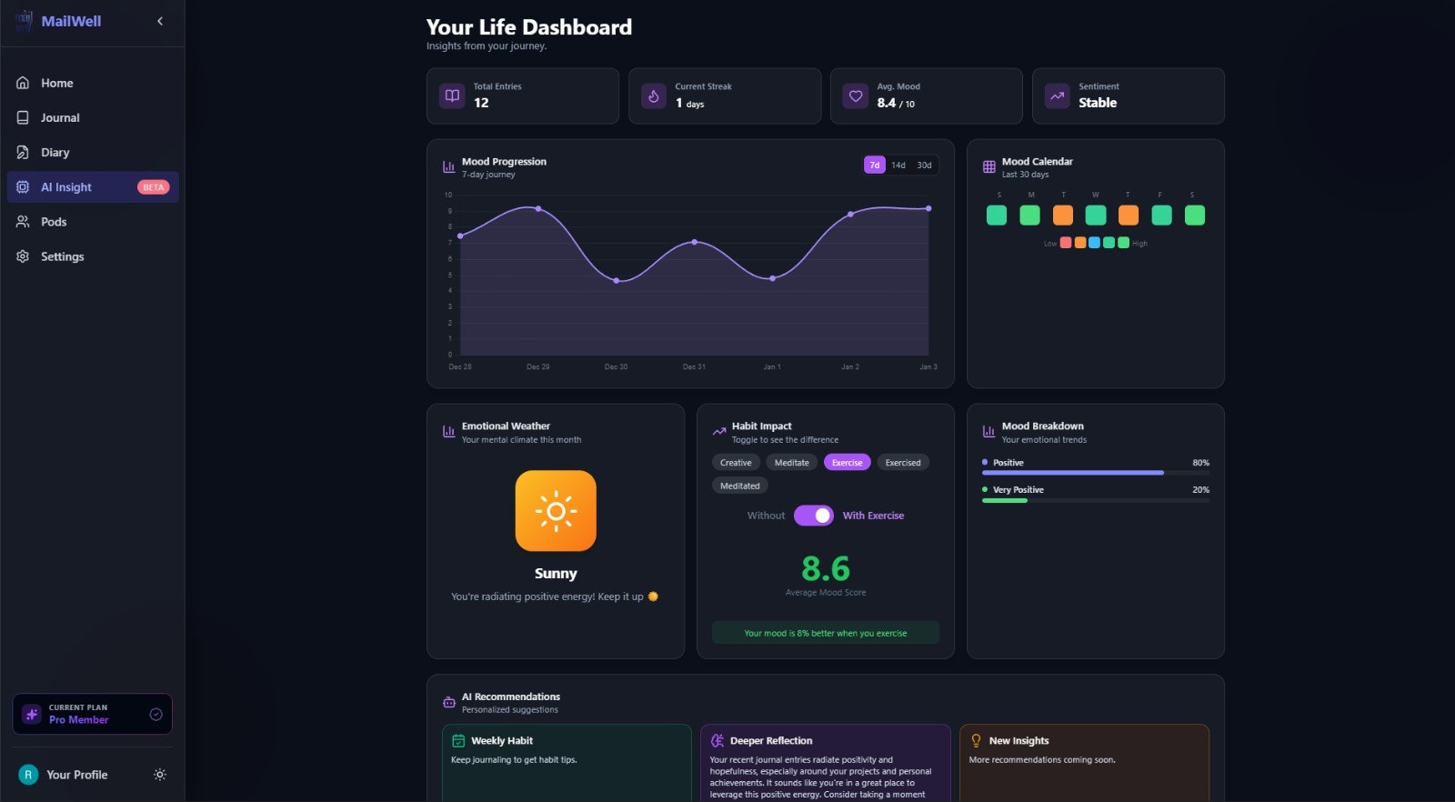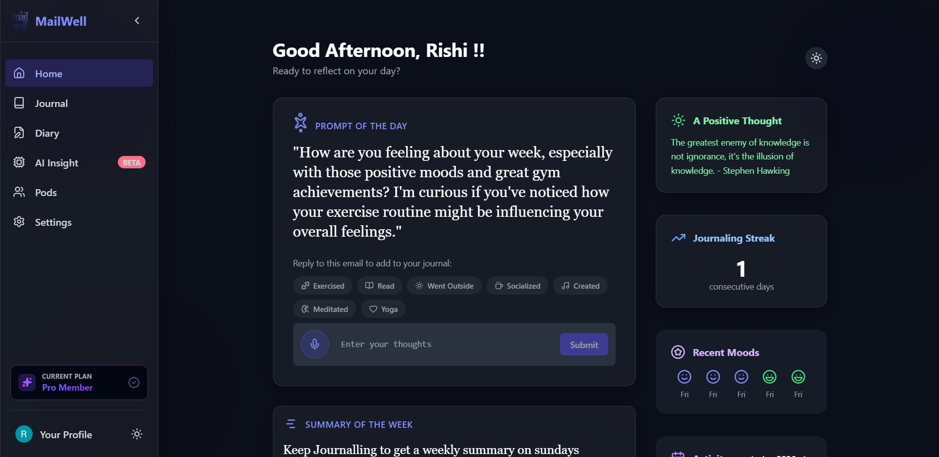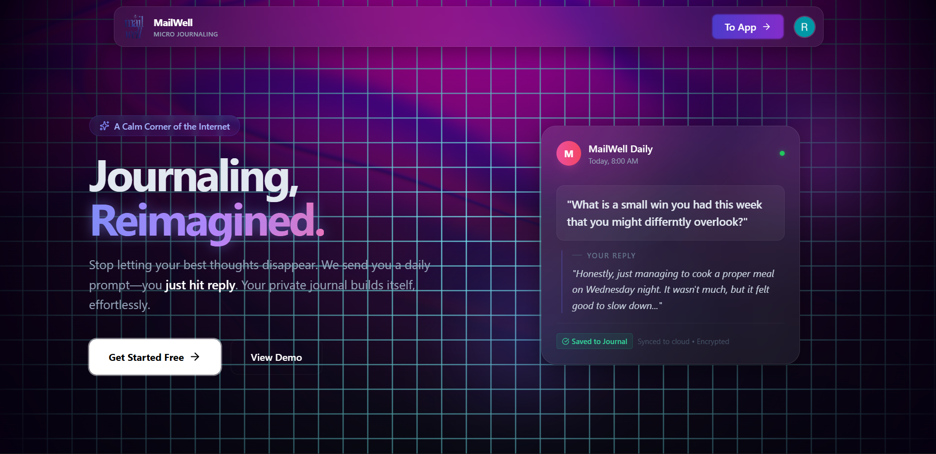 Journaling shouldn’t be a chore. Most journals stay empty because the blank page is intimidating. Mailwell meets you in your inbox. Reply to Reflect: Hit 'reply' to daily prompts. No apps, no friction. Speak Your Mind: Voice memos, auto-transcribed and synced. Deep Synthesis: A Weekly Reflection Letter highlighting your growth. Pods: Stay consistent with a private, small circle. Reflection is self-care, not a productivity hack. A simple conversation that builds your personal archive.