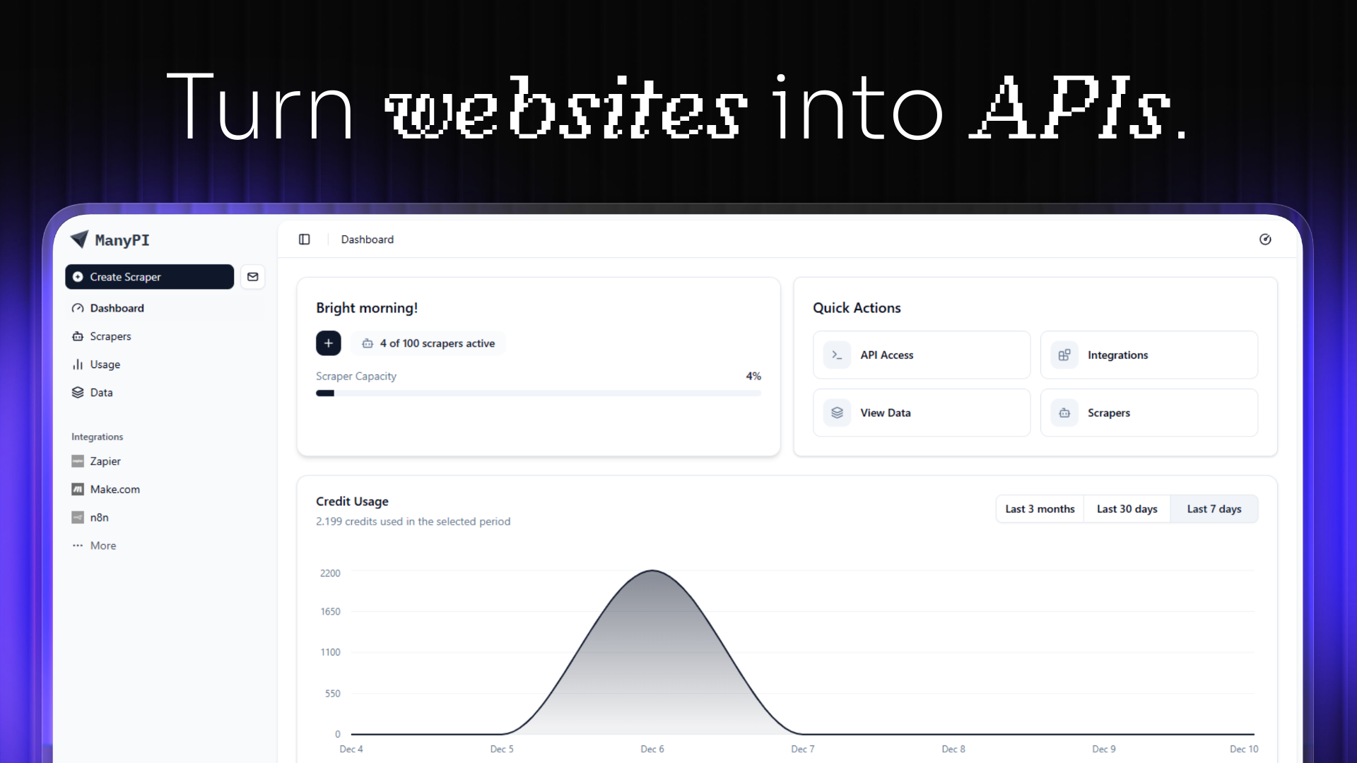 Convert any website into a clean, type-safe API. Use natural-language or JSON-schema prompts to extract data and get usable JSON output for RAG pipelines, sales, content aggregation, or research.