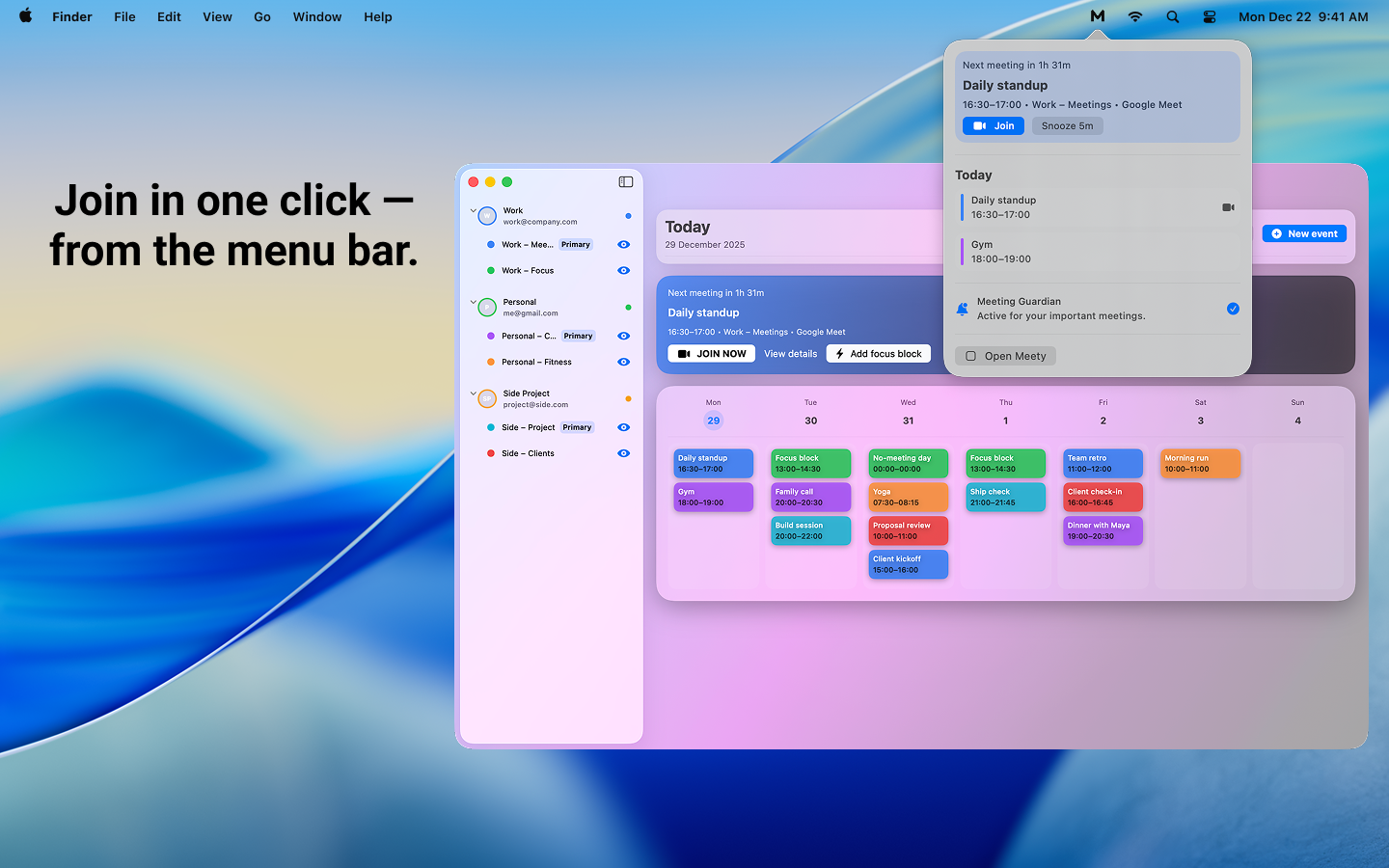 Google Calendar in your menu bar: quick join for meetings, reminders you can actually trust, and two-way sync for creating/editing events—built privacy-first for macOS.