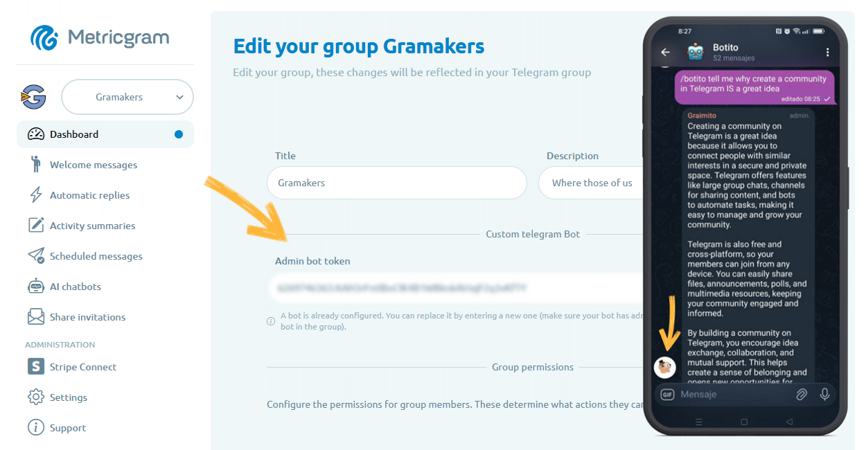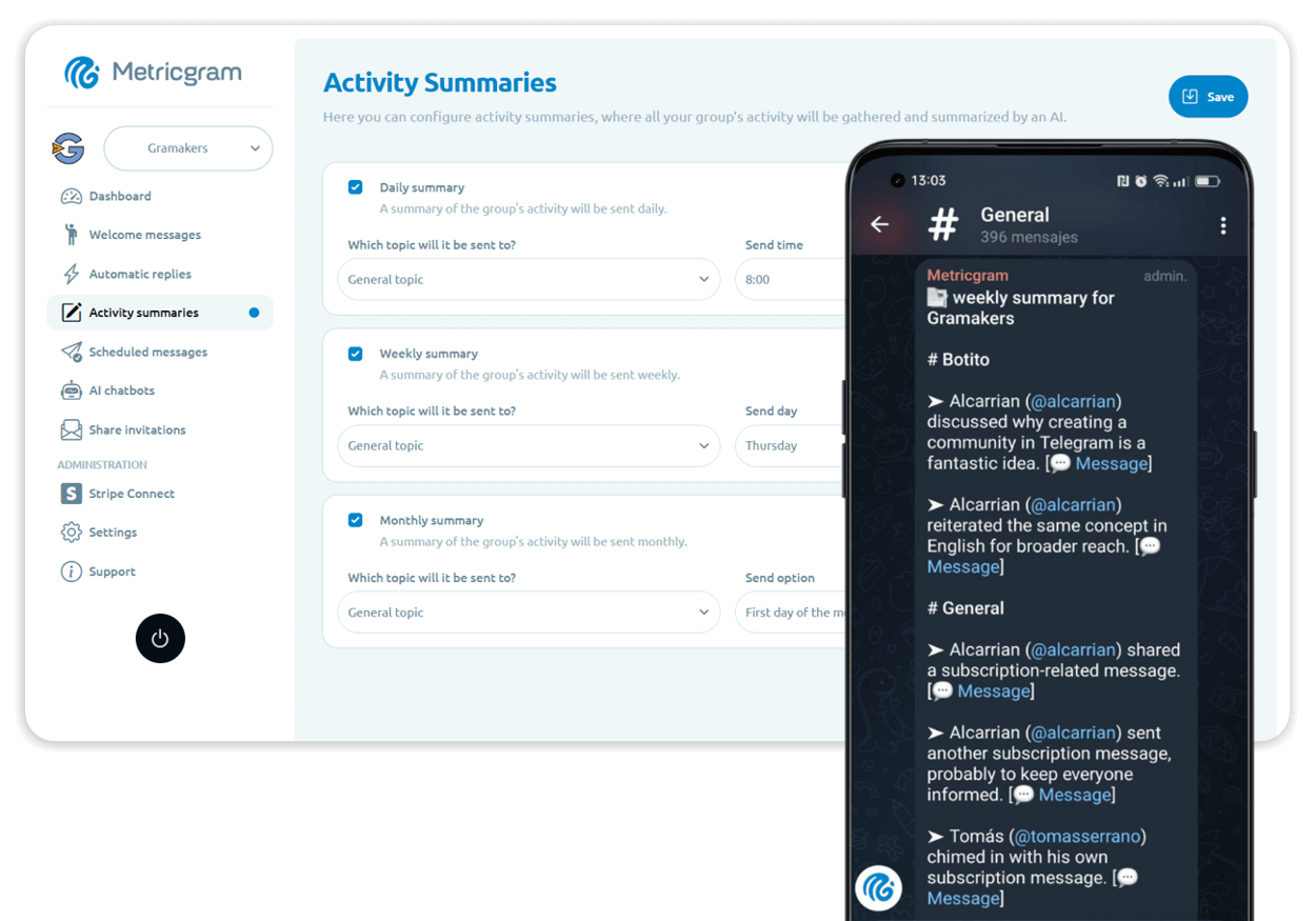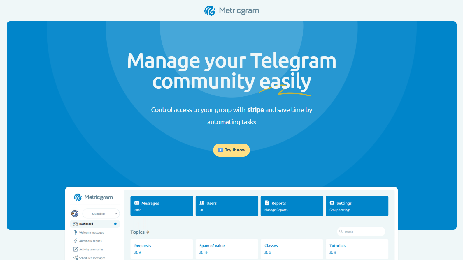 Save time managing your group or community on Telegram. Automate access to your group with Stripe, schedule messages, summaries, and automatic responses, analyze metrics and reports on everything that happens, add your own AI chatbot, and much more